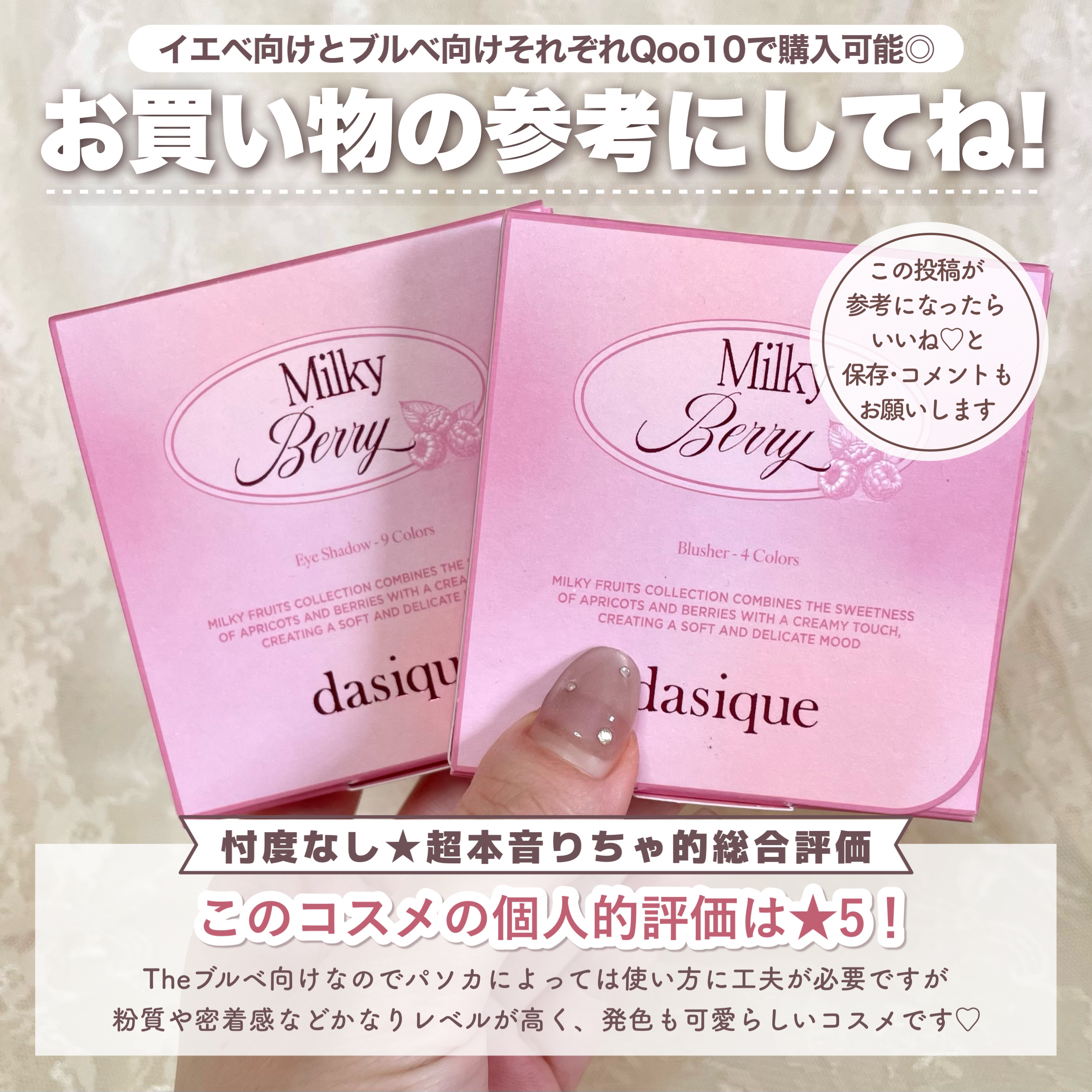 Dasique🍓ミルキーフルーツコレクション🫐アイシャドウパレット:33ミルキーベリーブレンディングムードチーク:19ミルキーベリーデイジーク新作でベリーメイク!ミルキーベリーはブルベ向けのカラーです(イエベ向けのミルキーアプリコットもあるよ...