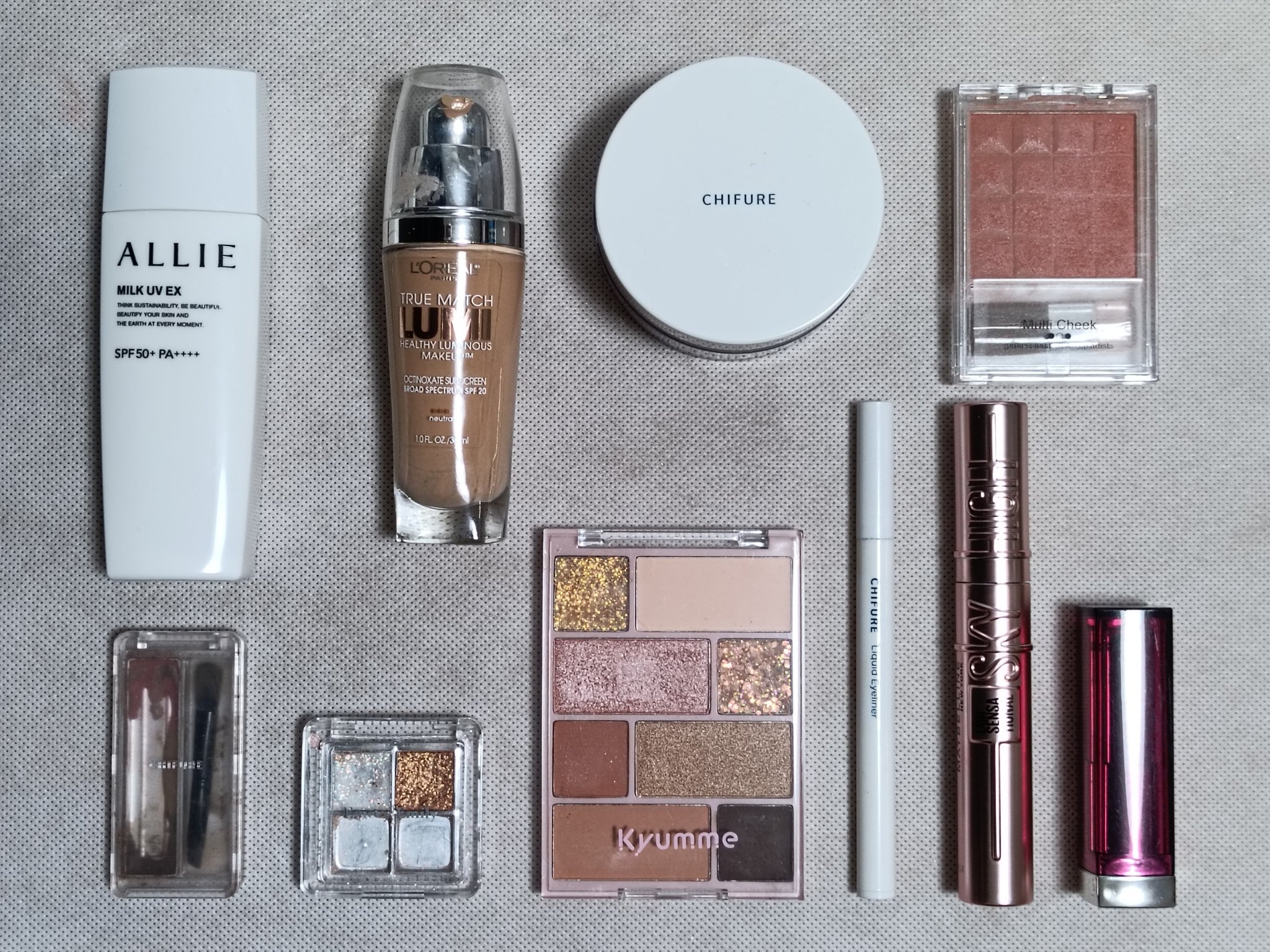 アリィー ニュアンスチェンジUV ジェル RSを、顔全体にまんべんなく塗ります。 RMK RMK ジェルクリーミィファンデーション 103を、顔全体にまんべんなく塗ります。 ジョンソンベビー ジョンソン ベビーパウダーを、顔全体にまんべんなく軽くはたきます。 THE BODY SHOP bronze shade warm glowを、両頬に塗ります。 KATE リフレクトミラーアイズ BR-1の締め色を、眉毛全体にまんべんなく塗ります。 URGLAM UR GLAMBLOOMING EYE COLOR PALETTE 01を、使用しました。 ちふれ リキッド アイライナー 筆ペンタイプ BK30 ブラックを、塗ります。 CEZANNE エアリーカールマスカラを、まつ毛全体にまんべんなく塗ります。 MAYBELLINE NEW YORK コロッサルボリュームエクスプレスを、まつ毛全体にまんべんなく塗ります。 MAYBELLINE NEW YORK SPステイ マットインク 135を、唇全体にまんべんなく塗ります。