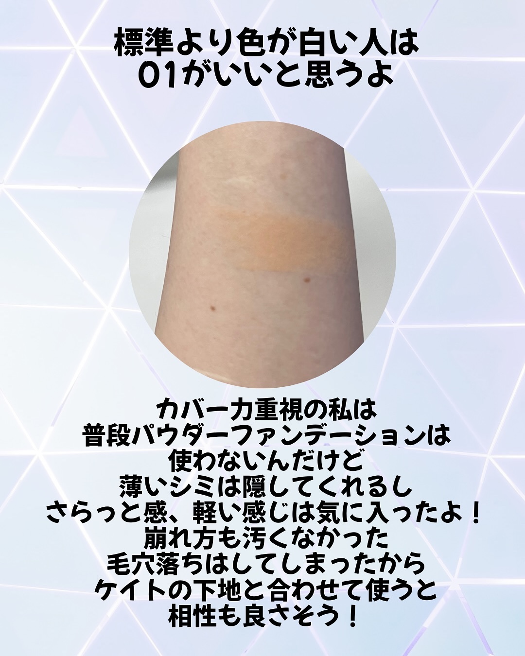 | ファンデーションランキング第197位 | 粉質は指で触るとなめらかで スルスルした触り心地です。 | 詳細を見る | |