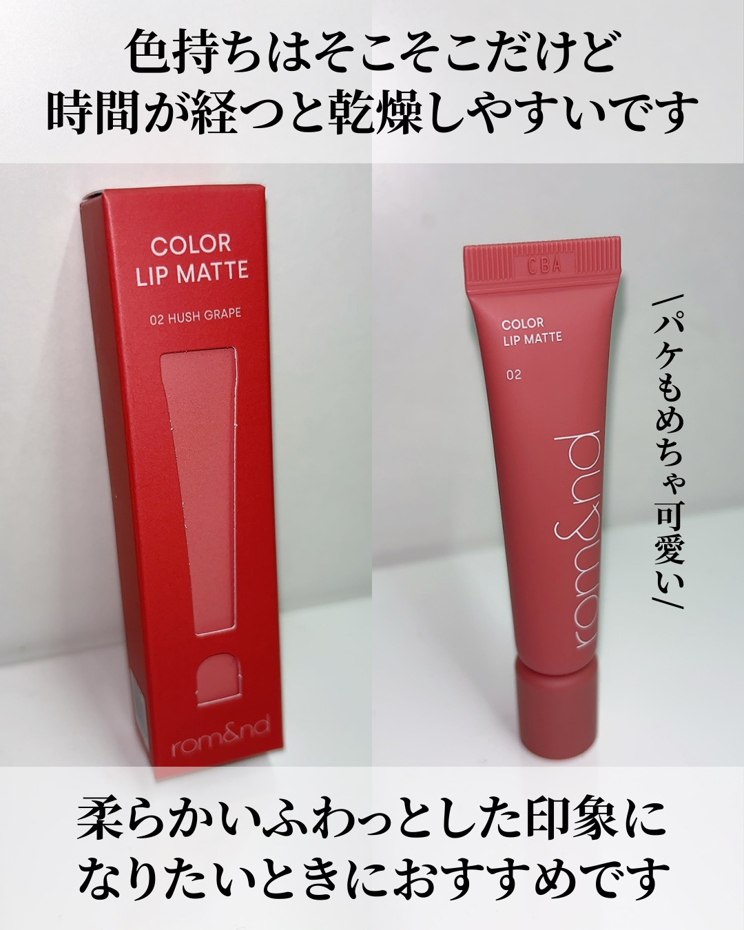 - これまで数々の人気リップを手掛けてきたrom&ndから、リッププライマーにカラーを加えた、新感覚「カラーリップマット」が登場。 チューブタイプで使いやすく、唇の縦ジワをカバーしながらふんわりと色づく、軽やかなマットリップです。1本でナチュラルに仕上げるのはもちろん、お手持ちのリップの下地としても使える万能アイテム。チークにも使えるので、流行りのリップ&チークアイテム として統一感のあるメイクに仕上がります。