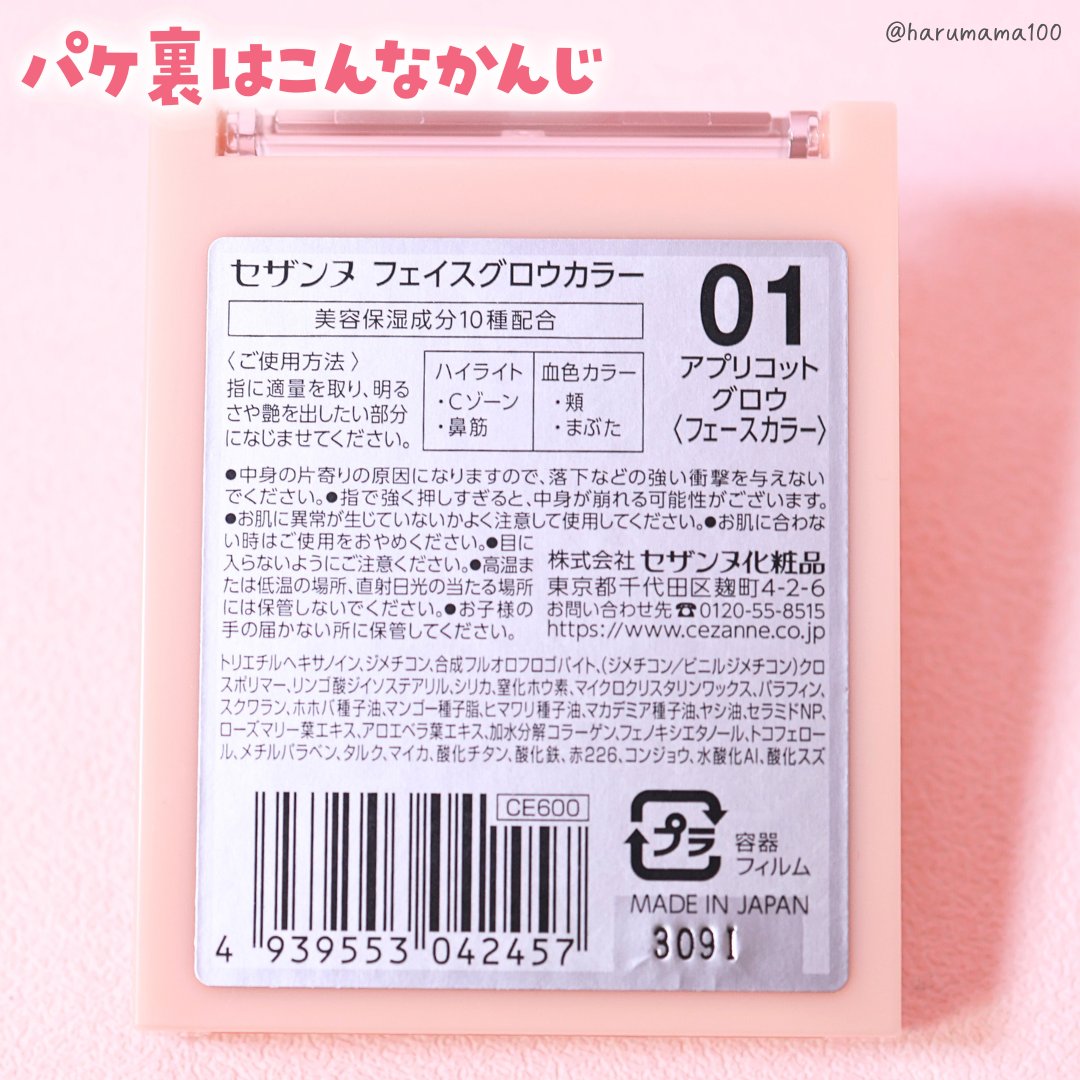 - <01 アプリコットグロウ> トリエチルヘキサノイン、ジメチコン、合成フルオロフロゴパイト、(ジメチコン/ビニルジメチコン)クロスポリマー、リンゴ酸ジイソステアリル、シリカ、窒化ホウ素、マイクロクリスタリンワックス、パラフィン、スクワラン、ホホバ種子油、マンゴー種子脂、ヒマワリ種子油、マカデミア種子油、ヤシ油、セラミドNP、ローズマリー葉エキス、アロエベラ葉エキス、加水分解コラーゲン、フェノキシエタノール、トコフェロール、メチルパラベン、タルク、マイカ、酸化チタン、酸化鉄、赤226、コンジョウ、水酸化Al、酸化スズ <02 ローズグロウ> トリエチルヘキサノイン、ジメチコン、合成フルオロフロゴパイト、(ジメチコン/ビニルジメチコン)クロスポリマー、リンゴ酸ジイソステアリル、シリカ、窒化ホウ素、マイクロクリスタリンワックス、パラフィン、スクワラン、ホホバ種子油、マンゴー種子脂、ヒマワリ種子油、マカデミア種子油、ヤシ油、セラミドNP、ローズマリー葉エキス、アロエベラ葉エキス、加水分解コラーゲン、フェノキシエタノール、トコフェロール、メチルパラベン、タルク、マイカ、酸化チタン、酸化鉄、赤226、コンジョウ、水酸化Al、酸化スズ、赤202 <03 ロマンスグロウ> トリエチルヘキサノイン、ジメチコン、合成フルオロフロゴパイト、(ジメチコン/ビニルジメチコン)クロスポリマー、リンゴ酸ジイソステアリル、シリカ、窒化ホウ素、マイクロクリスタリンワックス、パラフィン、スクワラン、ホホバ種子油、マンゴー種子脂、ヒマワリ種子油、マカデミア種子油、ヤシ油、セラミドNP、ローズマリー葉エキス、アロエベラ葉エキス、加水分解コラーゲン、フェノキシエタノール、トコフェロール、メチルパラベン、タルク、マイカ、酸化チタン、酸化鉄、赤226、コンジョウ、水酸化Al、酸化スズ、赤202 <SP1 ヨザクラグロウ> トリエチルヘキサノイン、ジメチコン、合成フルオロフロゴパイト、(ジメチコン/ビニルジメチコン)クロスポリマー、リンゴ酸ジイソステアリル、シリカ、窒化ホウ素、マイクロクリスタリンワックス、パラフィン、スクワラン、ホホバ種子油、マンゴー種子脂、ヒマワリ種子油、マカデミア種子油、ヤシ油、セラミドNP、ローズマリー葉エキス、アロエベラ葉エキス、加水分解コラーゲン、フェノキシエタノール、トコフェロール、メチルパラベン、タルク、マイカ、酸化チタン、酸化鉄、赤226、赤202、コンジョウ、グンジョウ、水酸化Al、酸化スズ