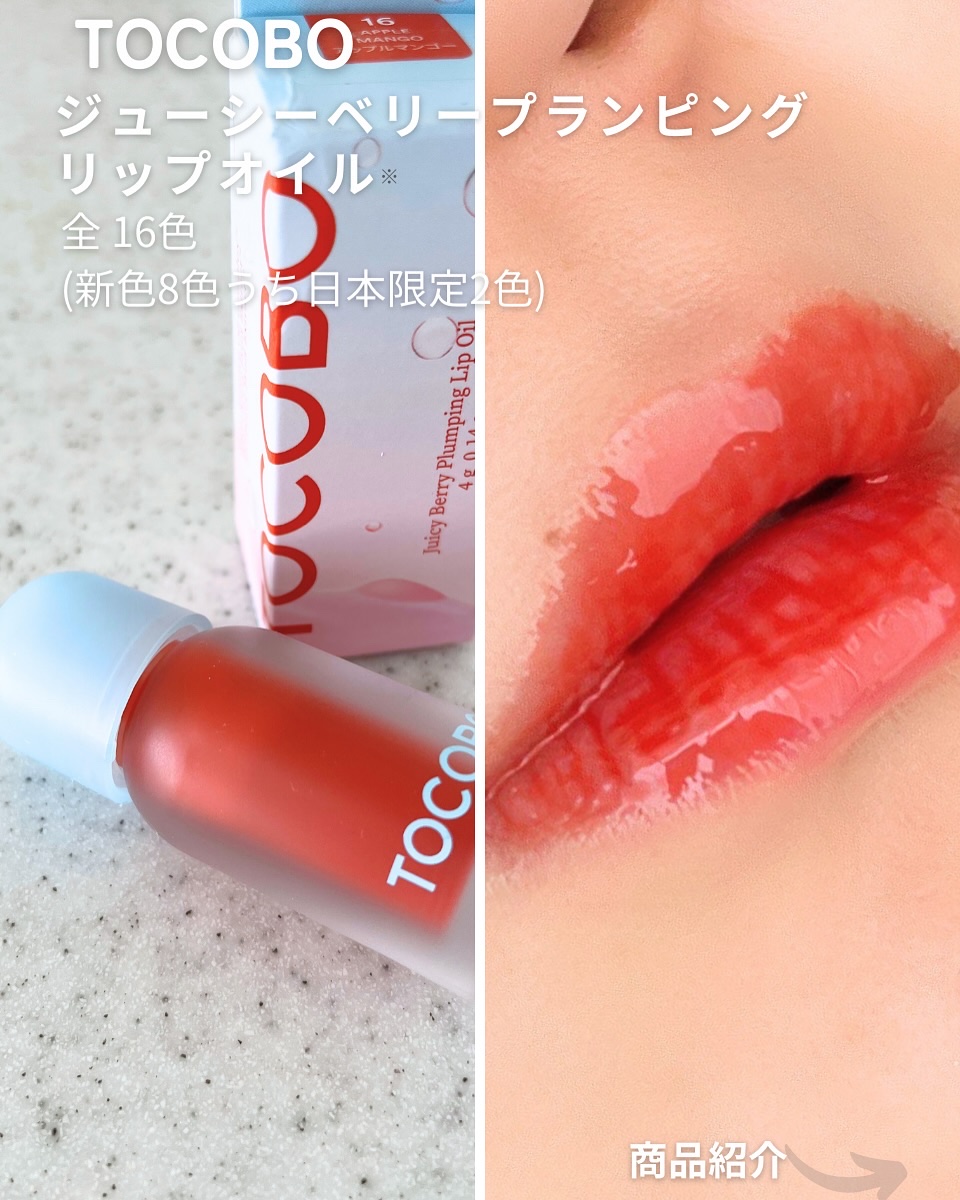 もうおなじみ?TOCOBOのジューシーベリープランピングリップオイル@tocobo_jp14号ピーチネクターと16号アップルマンゴーは日本限定販売の新色だよ🍑🍎🧡14号:桃を挽いたネクターのように甘いピーチピンク❤️16号:(アットコスメポッ...