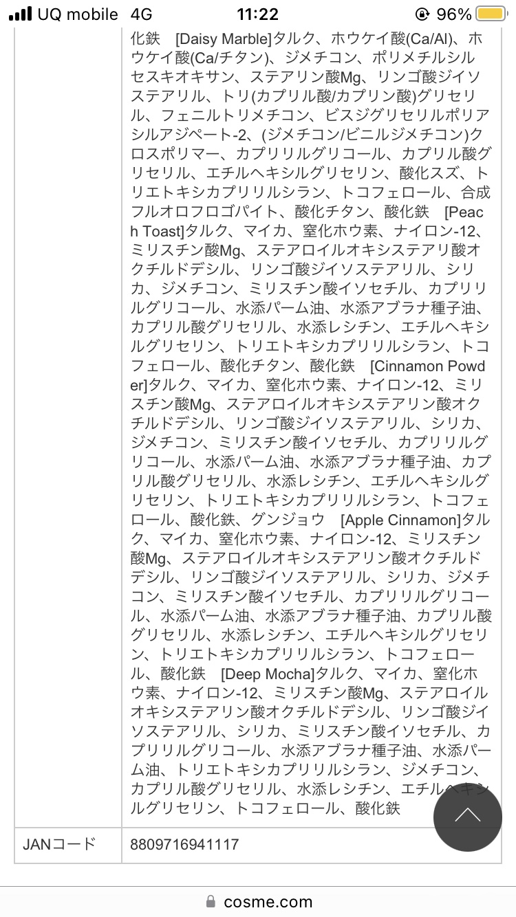 - <01 Ash Cinanamon(アッシュシナモン)> [Apricot Milk]タルク、マイカ、窒化ホウ素、ナイロン-12、ミリスチン酸Mg、ステアロイルオキシステアリン酸オクチルドデシル、リンゴ酸ジイソステアリル、ジメチコン、シリカ、ミリスチン酸イソセチル、カプリリルグリコール、水添アブラナ種子油、水添パーム油、カプリル酸グリセリル、水添レシチン、エチルヘキシルグリセリン、トリエトキシカプリリルシラン、トコフェロール、酸化チタン、酸化鉄 [Kaya Brown]タルク、マイカ、窒化ホウ素、ナイロン-12、ミリスチン酸Mg、ステアロイルオキシステアリン酸オクチルドデシル、リンゴ酸ジイソステアリル、シリカ、ジメチコン、ミリスチン酸イソセチル、カプリリルグリコール、水添パーム油、水添アブラナ種子油、カプリル酸グリセリル、水添レシチン、エチルヘキシルグリセリン、トリエトキシカプリリルシラン、トコフェロール、酸化チタン、酸化鉄 [Sun-Dried]タルク、マイカ、窒化ホウ素、ナイロン-12、ミリスチン酸Mg、ステアロイルオキシステアリン酸オクチルドデシル、リンゴ酸ジイソステアリル、シリカ、ジメチコン、ミリスチン酸イソセチル、カプリリルグリコール、水添パーム油、水添アブラナ種子油、カプリル酸グリセリル、水添レシチン、エチルヘキシルグリセリン、トリエトキシカプリリルシラン、トコフェロール、酸化チタン、酸化鉄 [Sparkling Coral]ホウケイ酸(Ca/チタン)、ジフェニルシロキシフェニルトリメチコン、ポリプロピレン、ダイマージリノール酸(フィトステリル/イソステアリル/セチル/ステアリル/ベヘニル)、ダイマージリノール酸水添ヒマシ油、リンゴ酸ジイソステアリル、水添ポリイソブテン、ポリメチルシルセスキオキサン、ポリブチレンテレフタレート、カプリリルグリコール、ジステアルジモニウムヘクトライト、(エチレン/VA)コポリマー、アクリレーツコポリマー、マイカ、カプリル酸グリセリル、酸化スズ、エチルヘキシルグリセリン、炭酸プロピレン、トコフェロール、合成フルオロフロゴパイト、酸化チタン、酸化鉄、カルミン [Chocolate Chunk]タルク、マイカ、窒化ホウ素、ナイロン-12、ミリスチン酸Mg、ステアロイルオキシステアリン酸オクチルドデシル、リンゴ酸ジイソステアリル、シリカ、ミリスチン酸イソセチル、ジメチコン、カプリリルグリコール、水添パーム油、水添アブラナ種子油、トリエトキシカプリリルシラン、カプリル酸グリセリル、水添レシチン、エチルヘキシルグリセリン、トコフェロール、酸化チタン、酸化鉄 [Daisy Marble]タルク、ホウケイ酸(Ca/Al)、ホウケイ酸(Ca/チタン)、ジメチコン、ポリメチルシルセスキオキサン、ステアリン酸Mg、リンゴ酸ジイソステアリル、トリ(カプリル酸/カプリン酸)グリセリル、フェニルトリメチコン、ビスジグリセリルポリアシルアジペート-2、(ジメチコン/ビニルジメチコン)クロスポリマー、カプリリルグリコール、カプリル酸グリセリル、エチルヘキシルグリセリン、酸化スズ、トリエトキシカプリリルシラン、トコフェロール、合成フルオロフロゴパイト、酸化チタン、酸化鉄 [Peach Toast]タルク、マイカ、窒化ホウ素、ナイロン-12、ミリスチン酸Mg、ステアロイルオキシステアリン酸オクチルドデシル、リンゴ酸ジイソステアリル、シリカ、ジメチコン、ミリスチン酸イソセチル、カプリリルグリコール、水添パーム油、水添アブラナ種子油、カプリル酸グリセリル、水添レシチン、エチルヘキシルグリセリン、トリエトキシカプリリルシラン、トコフェロール、酸化チタン、酸化鉄 [Cinnamon Powder]タルク、マイカ、窒化ホウ素、ナイロン-12、ミリスチン酸Mg、ステアロイルオキシステアリン酸オクチルドデシル、リンゴ酸ジイソステアリル、シリカ、ジメチコン、ミリスチン酸イソセチル、カプリリルグリコール、水添パーム油、水添アブラナ種子油、カプリル酸グリセリル、水添レシチン、エチルヘキシルグリセリン、トリエトキシカプリリルシラン、トコフェロール、酸化鉄、グンジョウ [Apple Cinnamon]タルク、マイカ、窒化ホウ素、ナイロン-12、ミリスチン酸Mg、ステアロイルオキシステアリン酸オクチルドデシル、リンゴ酸ジイソステアリル、シリカ、ジメチコン、ミリスチン酸イソセチル、カプリリルグリコール、水添パーム油、水添アブラナ種子油、カプリル酸グリセリル、水添レシチン、エチルヘキシルグリセリン、トリエトキシカプリリルシラン、トコフェロール、酸化鉄 [Deep Mocha]タルク、マイカ、窒化ホウ素、ナイロン-12、ミリスチン酸Mg、ステアロイルオキシステアリン酸オクチルドデシル、リンゴ酸ジイソステアリル、シリカ、ミリスチン酸イソセチル、カプリリルグリコール、水添アブラナ種子油、水添パーム油、トリエトキシカプリリルシラン、ジメチコン、カプリル酸グリセリル、水添レシチン、エチルヘキシルグリセリン、トコフェロール、酸化鉄 <02 Ash Mauve(アッシュモーヴ)> [Cream Pink]タルク、マイカ、窒化ホ