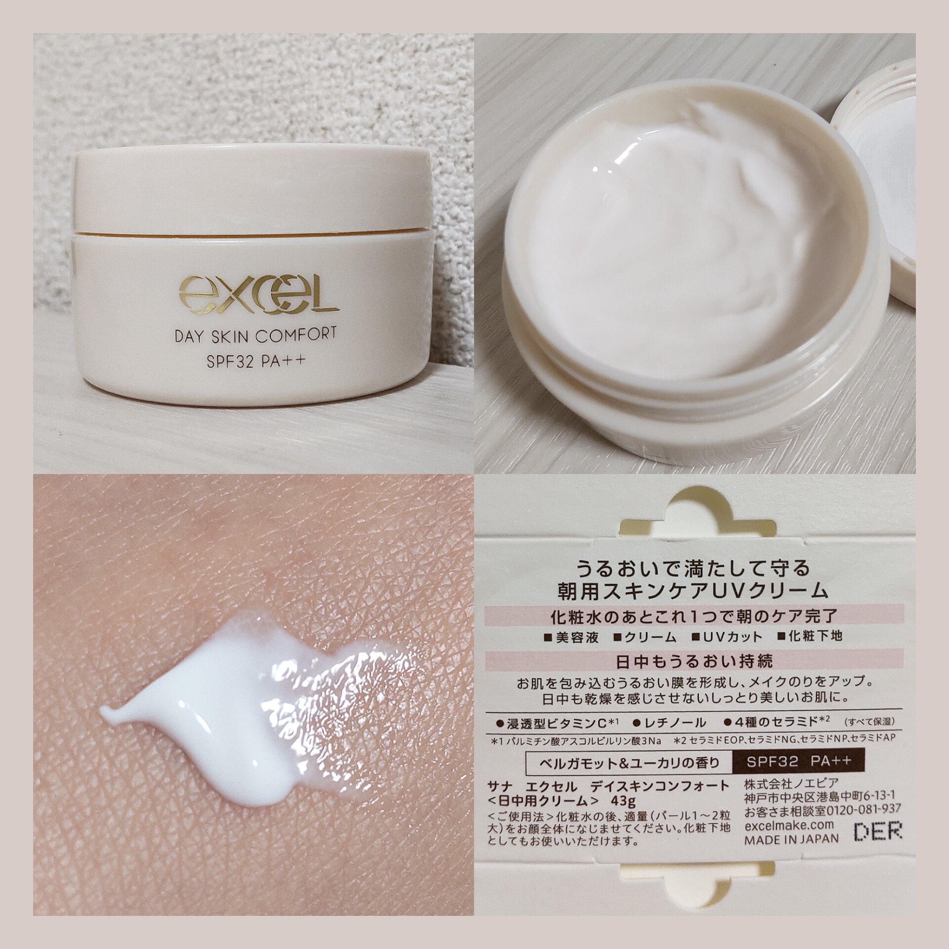 - うるおいで満たして守る朝用スキンケアUVクリーム 化粧水のあとこれ1つで朝のケア完了 ■美容液 ■クリーム ■UVカット ■化粧下地 日中もうるおい持続 うるおい膜でお肌を包み込み、メイクのりをアップ。 日中も乾燥を感じにくいしっとり美しいお肌に。 ●浸透*1型ビタミンC*2 ●レチノール ●4種のセラミド*3(すべて保湿) SPF32 PA++ 日中用クリーム 1日の始まりにやわらぐベルガモット&ユーカリの香り お好みの下地を重ねてもOK *1角質層まで *2パルミチン酸アスコルビルリン酸3Na *3セラミドEOP、セラミドNG、セラミドNP、セラミドAP 【エクセル ’24 ベースアイテムセット DC】 ◇お肌に異常が生じていないかよく注意して使用してください。 ◇傷・はれもの・しっしん等異常のあるときは、お使いにならないでください。 ◇使用中、または使用後日光にあたって、赤味・はれ・かゆみ・刺激・色抜け(白斑等)や黒ずみ等の異常があらわれたときは、使用を中止し、皮フ科専門医等にご相談されることをおすすめします。そのまま化粧品類の使用を続けますと悪化することがあります。 ◇極端な高温や低温、直射日光を避け、乳幼児の手の届かないところに保管してください。 サナ エクセル デイスキンコンフォート ◇使用後はしっかりフタを閉めてください。 ◇衣服についた場合、塩素系漂白剤の使用は避けてください。 サナ エクセル フェザライズオン パウダー ◇落としたり、強い衝撃を与えたりすると中身が割れることがありますのでご注意ください。