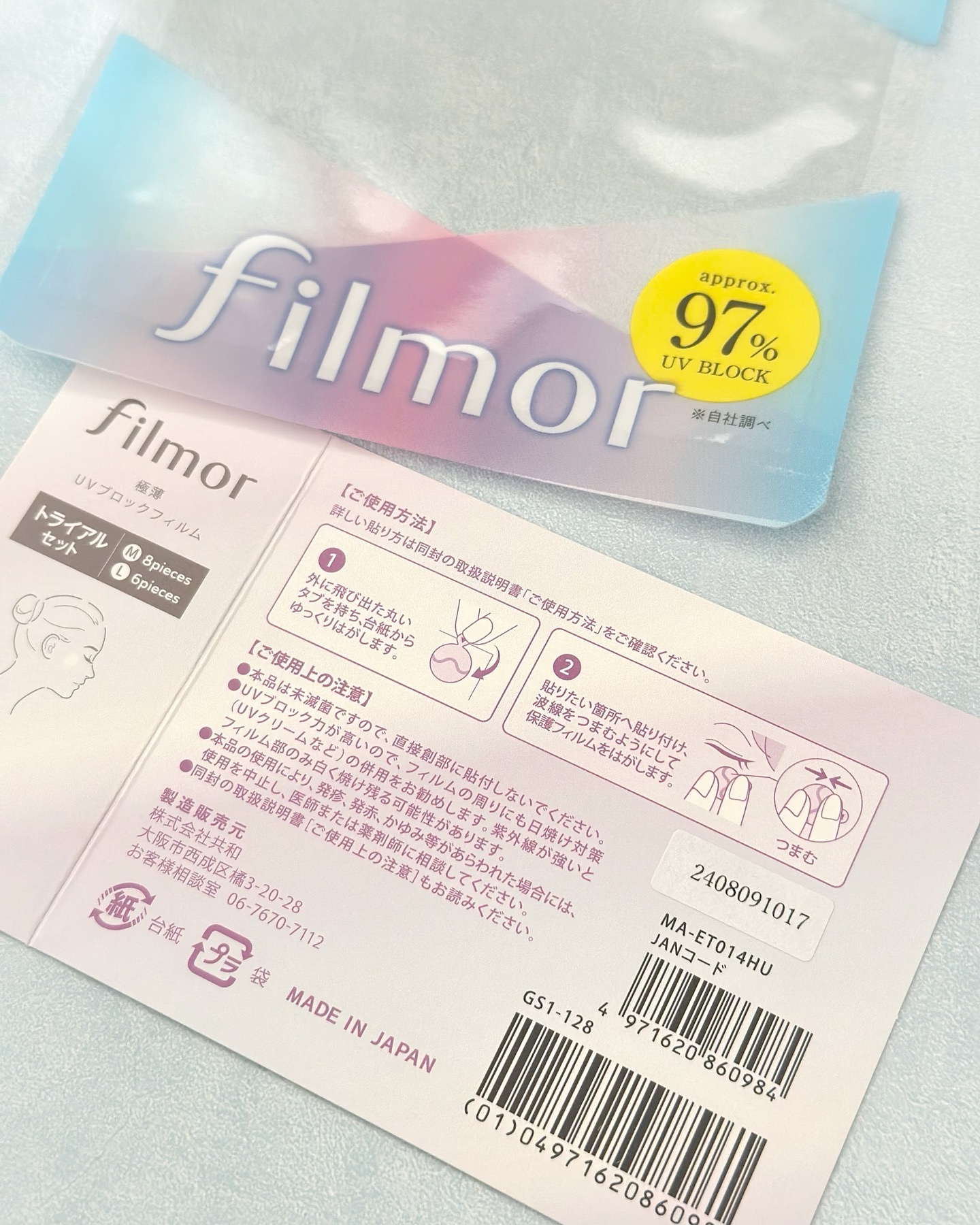 - UVを約97%*1カットして、ニキビ跡・キズあと・シミ・レーザー後の肌を守る*2、極薄UVブロックフィルム。 日常使いから、ゴルフ・海水浴などのアウトドアまで、幅広くご使用いただけます。 【貼っている間ずっとUV・摩擦や乾燥の刺激から肌を守る】 filmorは貼っている間、高いUVブロック率がずっと続きます。 衣類等との摩擦にも強く、防水性があるため、肌からはがれにくく長時間ご使用いただけます。 【快適な貼りごこち】 フィルムの薄さは0.007mm(卵の薄皮の約1/10の薄さ)と極薄。貼っていることを忘れるほど、とても軽くやわらかい貼りごこちです。 また、汗をかいてもムレにくいフィルムを使用しているので暑い季節でも快適にお使いいただけます。 【透明で目立ちにくい】 透明でテカリを抑えたフィルムなので、周りから貼っていることが気付かれにくいです。 また上からメイクをしていただくと、さらに自然な仕上がりに。 フィルムを貼ることで、キズあとに直接化粧品や指が触れることを防ぎます。 *1自社調べ *2フィルムの物理的効果による
