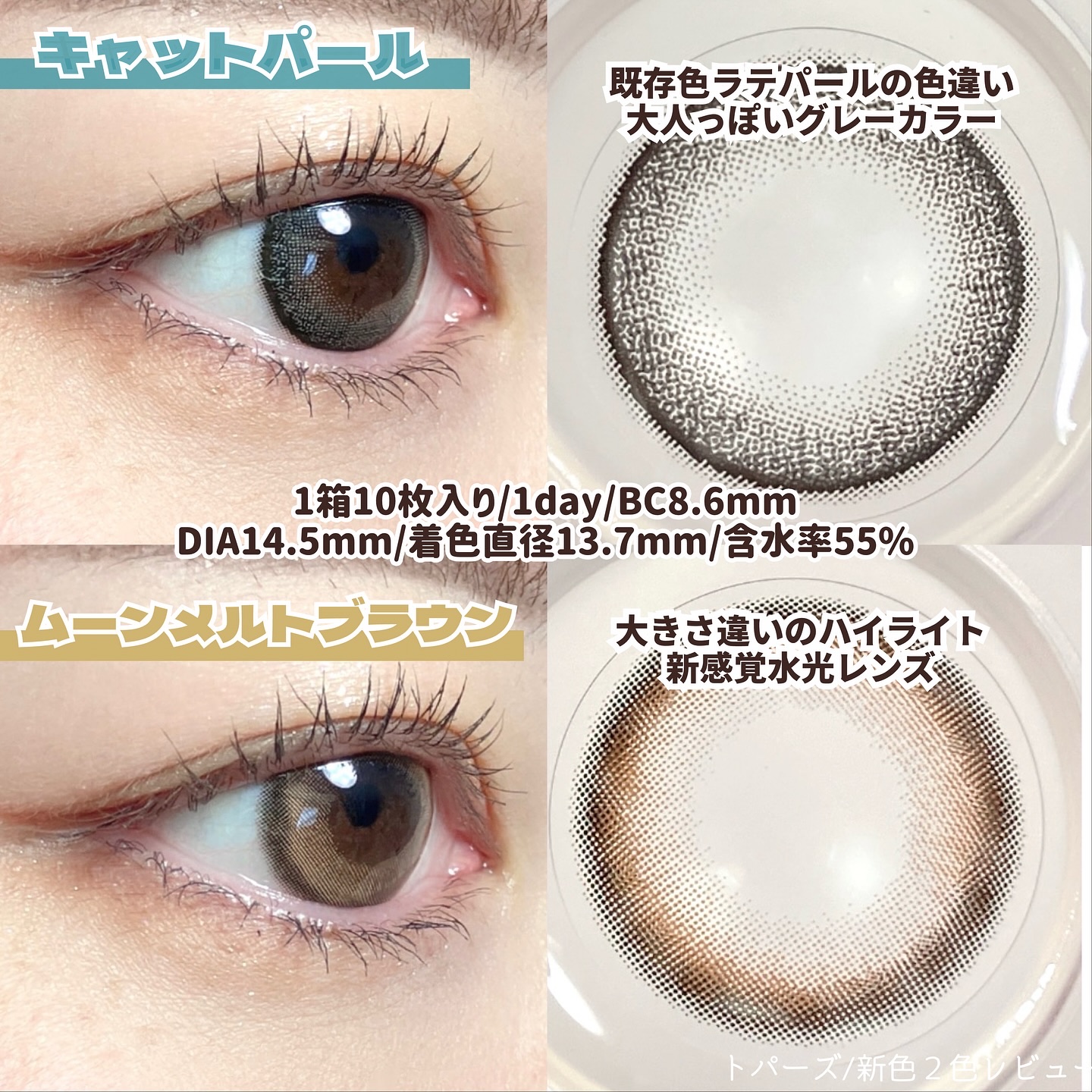 TOPARDS新色!うるっときらめく美人盛れレンズ🫧TOPARDS1dayキャットパールムーンメルトブラウンDIA14.5mm/BC8.6mm含水率55%(既存色は38%)1PACK10PCS¥1600税込NEW!2025.3.27◆キャット...