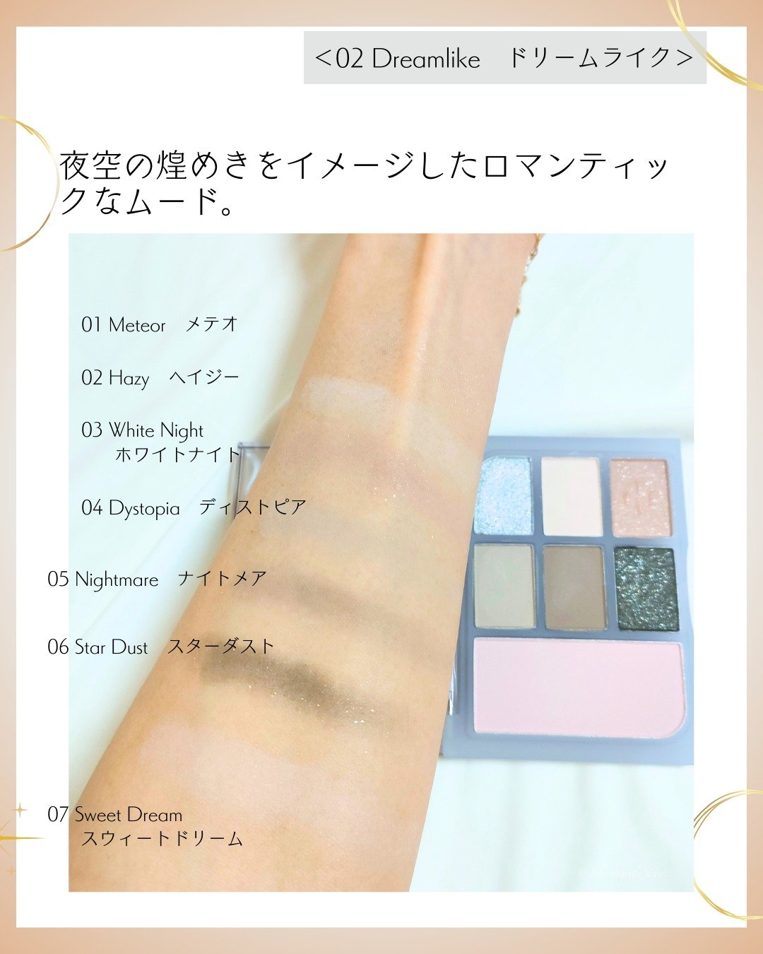 - 多彩なテクスチャーと繊細に調和するカラーペアリングで簡単にメイクを完成させるパレット。 感覚的でありながら、なじみのいい7種のカラーで構成されており、どんな色の組み合わせでも調和をとりやすい構成になっています。テクスチャーはマットタイプでありながら、グリッターは潤いを含み、透明感のある輝きを長く維持します。引き締めカラーにはパールが入っており、残像のようなかすかに輝きを与えてくれます。