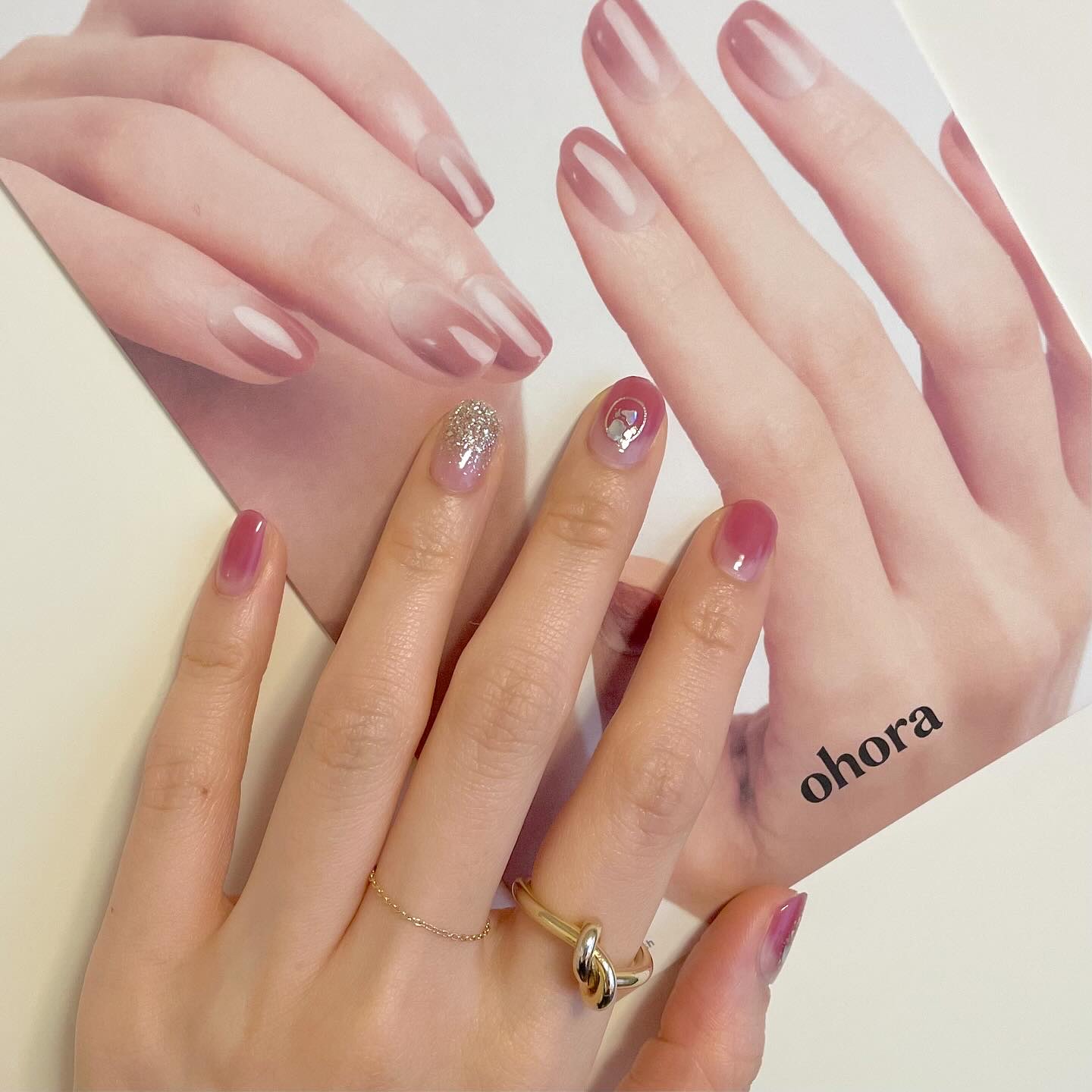 ■ohoraネイルシール*NOmbrerBeigeサロン級仕上がりのネイルが一人でも自宅で気軽に、簡単にできる💅🏻ネイルシールを貼って、爪のサイズに合わせてカット✨ジェルランプで固めるだけで完成なので、とても簡単でした!basicとpoint...