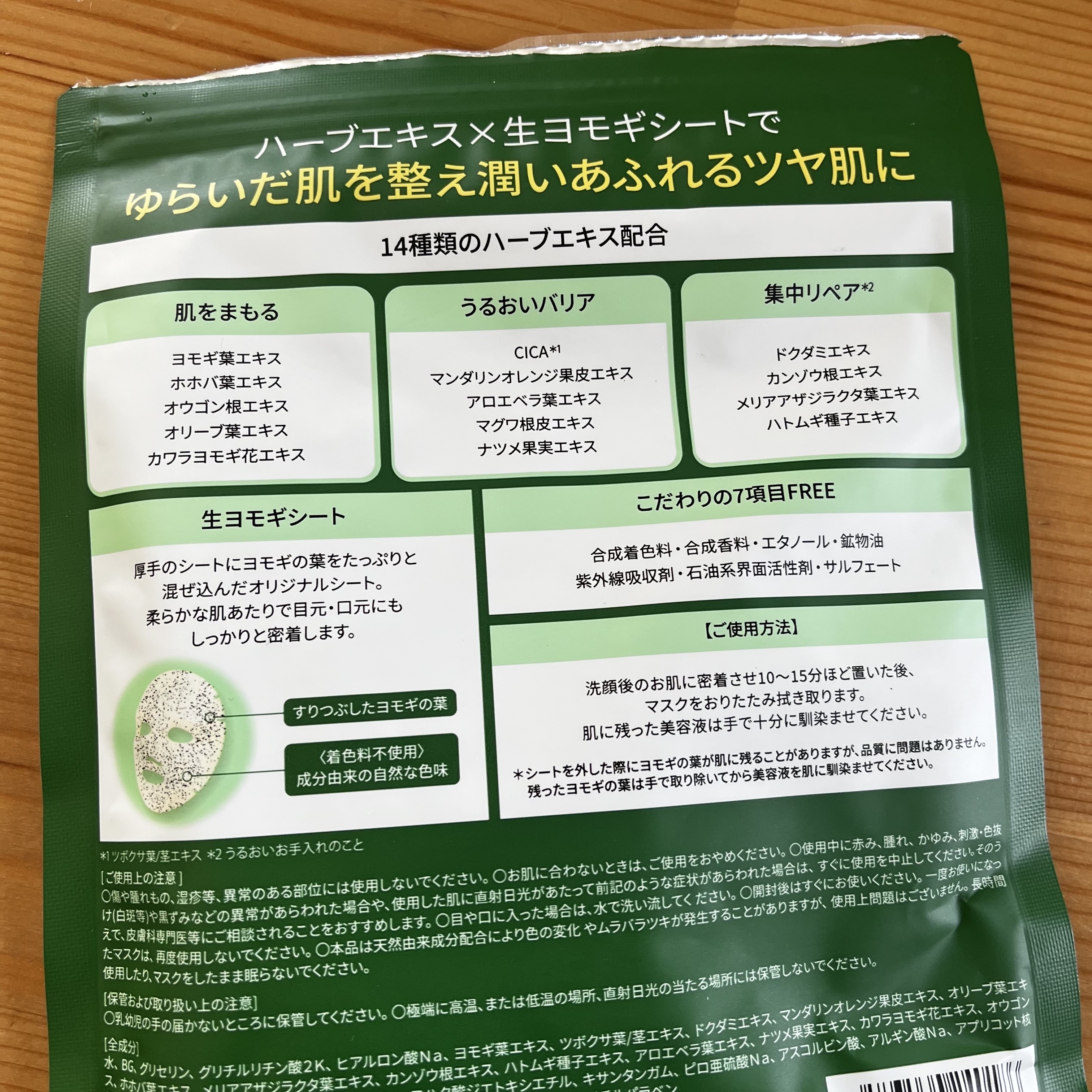 - ハーブエキス*×生ヨモギ*シートでゆらぎがちな肌を整え潤いあるツヤ肌へ。 乾燥や肌荒れを防いで肌を整える自然由来のハーブエキスを14種類配合。 また保湿や肌ひきしめ・整肌作用が期待できることからハーブの女王とも呼ばれるヨモギの葉をすりつぶし、たっぷりと混ぜ込んだオリジナルシートとともに乱れやすい肌環境を整え、潤いたっぷりと補給します。 *保湿成分