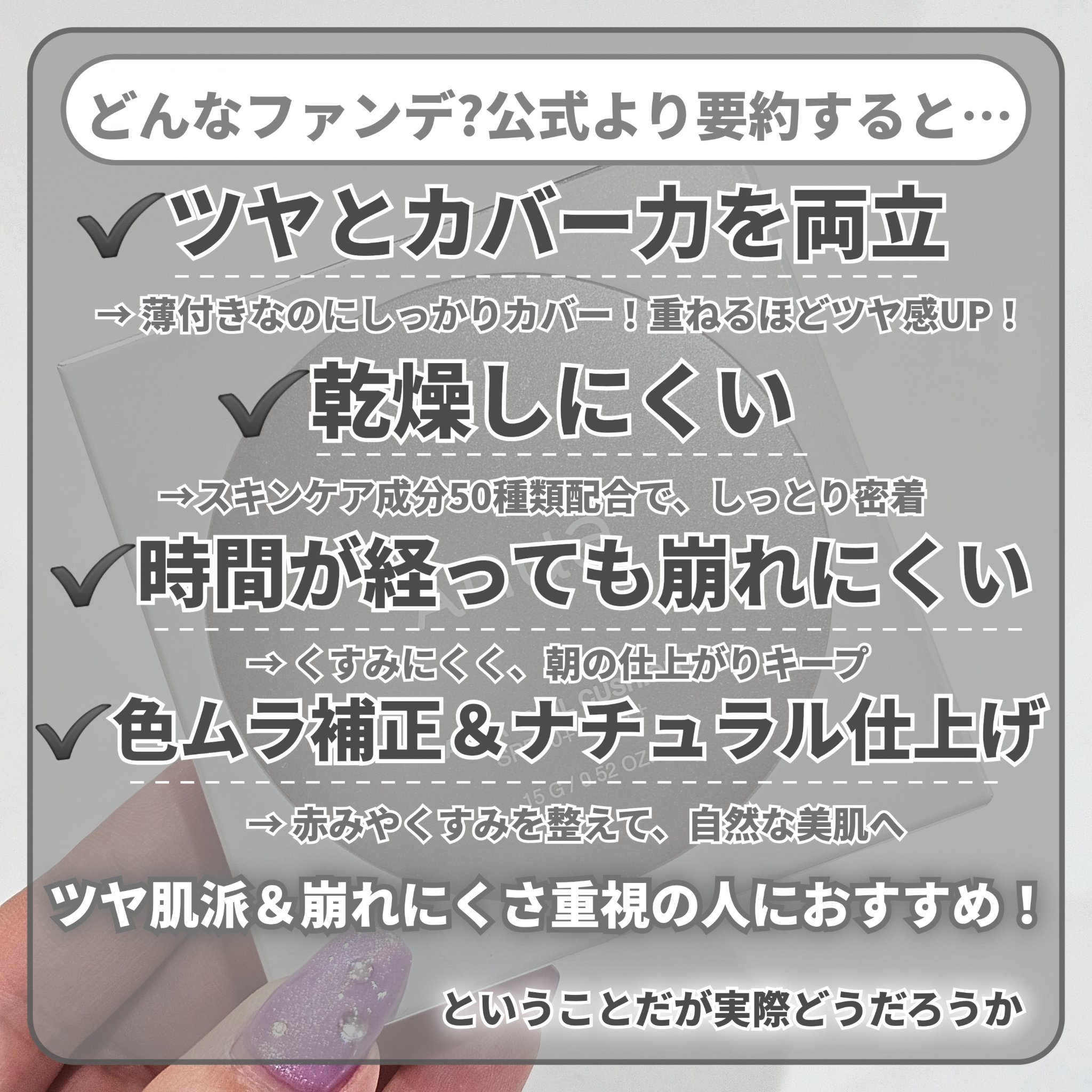 | ファンデーションランキング第3位 | メッシュ構造のクッションファンデーションで、そのテクスチャーはみずみずしくなめらか✨ 軽やかなつけ心地なのに、しっかりカバーしてくれます◎ | 詳細を見る | |