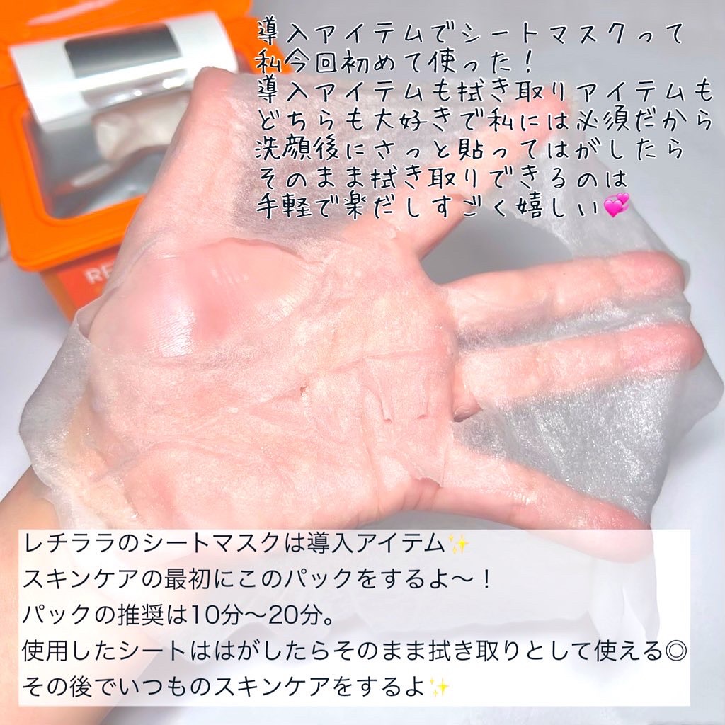 - <角質オフと保湿のWケア!1枚で肌キメを「整え」、うるおいを「与える」シートマスク> 昨今、韓国の肌管理*1としても注目を集めている第4世代ピーリングに着想を得て開発したレチララ デイリーシートマスクには肌管理*1の際に用いられるLHAを配合。余分な角質をやさしい使い心地で拭き取ってオフし肌キメを整えるため、その後のスキンケアの浸透*2を助けます。さらにレチノールとバクチオールをはじめとする美容成分を配合し、毛穴*3の目立ちにくい透明感*4のあるハリ素肌へと整えます。 シートは薄手で心地よく密着するユーカリ由来の上質なリヨセル素材を採用。肌にピタッとフィットして角質層のすみずみまで美容保湿成分を届けます。 <ファーストステップ使いでスキンケアの浸透*2をサポート!> レチララ デイリーシートマスクは洗顔後のスキンケアのファーストステップとしてお使いいただくこともおすすめしています。角質を拭き取ってオフすることで肌を柔らかく整えるので、その後の美容液などの浸透*2をサポート。スキンケアをワンランクアップさせてくれます。 ①洗顔後、スキンケアの最初にレチララ デイリーシートマスクを顔に密着させます。 ②10~20分おいてからマスクをはがして折り畳み、顔全体を優しく拭き取ります。 ③顔に残った美容液はハンドプレスで肌になじませてください。 <こんな方におすすめ> ‧乾燥で肌のごわつきが気になる ‧化粧のりが悪い ‧やさしい使い心地で角質ケアがしたい *1:うるおいケアのこと *2:角質層まで *3:肌をうるおいを与えることによって、毛穴が目立ちにくくなること *4:うるおいを与えることによる肌印象のこと LHA/カプリロイルサリチル酸、レチノール、バクチオール(全て整肌成分) 先行発売日:2025年2月28日(金)よりQoo10にて、3月1日(土)よりロフトにて先行発売。