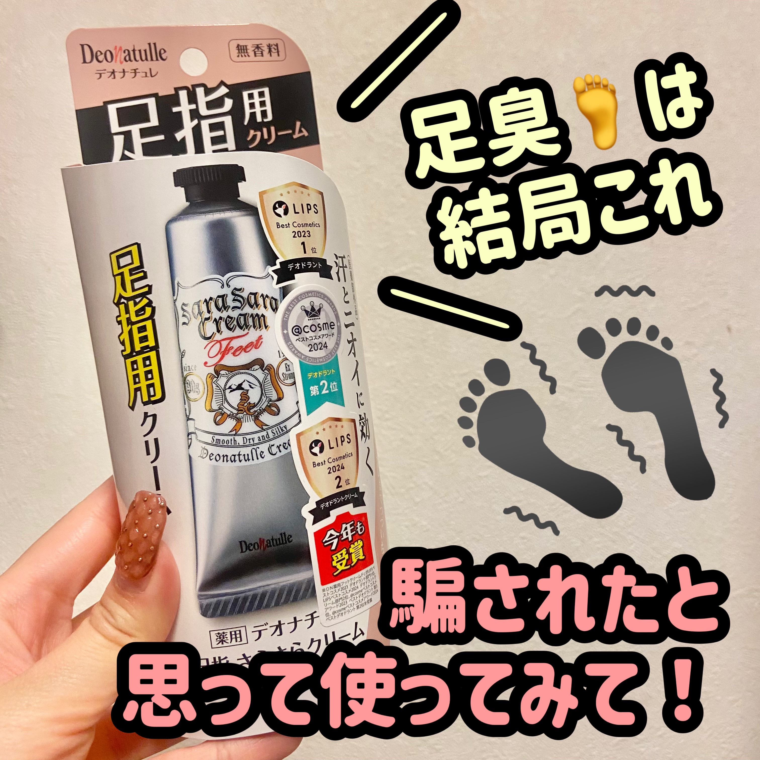 - \11年間ず~っと売上No.1*直ヌリ制汗デオドラントブランド/ 『防臭力のデオナチュレ』シリーズから、足特有のムレ・ニオイを防ぐ足用処方「薬用デオナチュレ足指さらさらクリーム」 ◆◆靴、脱ぐの⁈とドキッとすること、ありませんか?◆◆ 足は1日コップ約1杯分の汗をかき、ムレて、ニオイやすい だから、デオナチュレの足用でケア! ◆◆ユーザーから選ばれる理由◆◆ 1.天然アルム石に着目。有効成分「焼ミョウバン」を配合し、汗・ニオイを元から防ぐ! 足汗吸収さらさらパウダー**やティーツリーハーブ・ローズマリーエキス***を配合 2.ニオイの発生源に“直ヌリ”で、朝ぬって夜まで続いちゃう! 3.クリームなのに、ベタつかず・白残りしにくい ==注意== ●顔・粘膜を避け、除脱毛直後や肌に異常があるときは使用しないでください。●肌に異常が生じていないかよく注意してご使用ください。また、お肌に合わないとき、使用中に赤み、はれ、かゆみ、刺激、色抜け(白班等)や黒ずみ等の異常があらわれたときは、使用を中止し、皮フ科専門医などにご相談ください。●使用後はキャップをしっかり閉め、直射日光や高温多湿を避けて保管してください。●乳幼児の手の届かないところに置いてください。●床、靴、衣類などにつかないようご注意ください。 販売名:DN薬用フットクリームFc *インテージSRI+直ヌリ制汗剤市場(形状:ロールオン・スティック・クリーム・ジェル・パウダー) 2013年5月~2024年4月 デオナチュレシリーズ 累計販売金額 **基剤:無水ケイ酸 ***保湿成分
