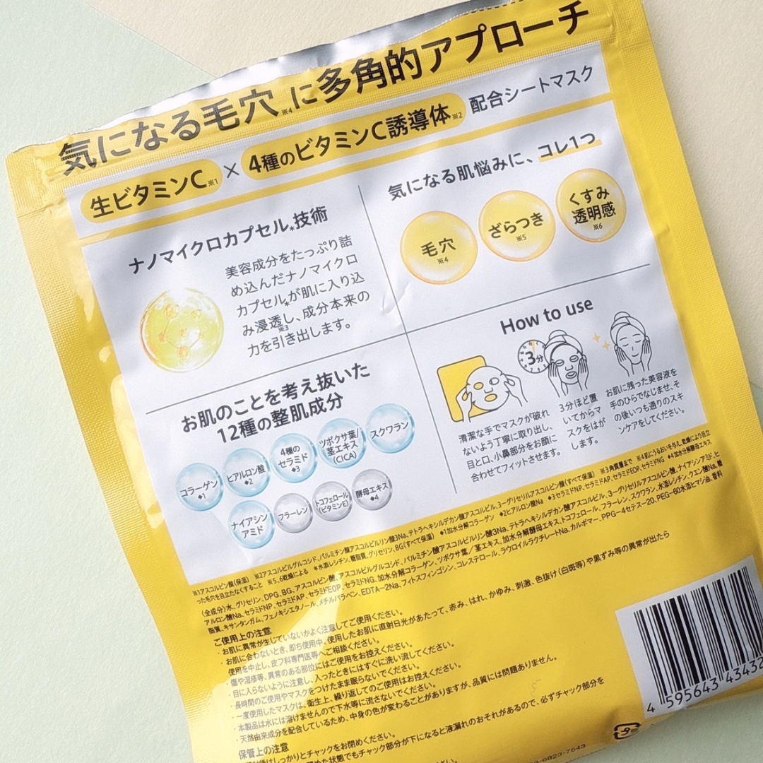 お肌に浸透しやすいナノマイクロカプセルに濃縮した、生ビタミンCと5種類のビタミンC誘導体を配合したシートマスクなんだとか❣ 柔らかで薄めのシートにみずみずしい美容液が滴るくらいたっぷりひたひたに入ってます◎ 爽やかなマンダリンの香りが良い香り〜🍊 しっとりとした使い心地で置き時間が3分と短めなのも嬉しいポイントです🙆