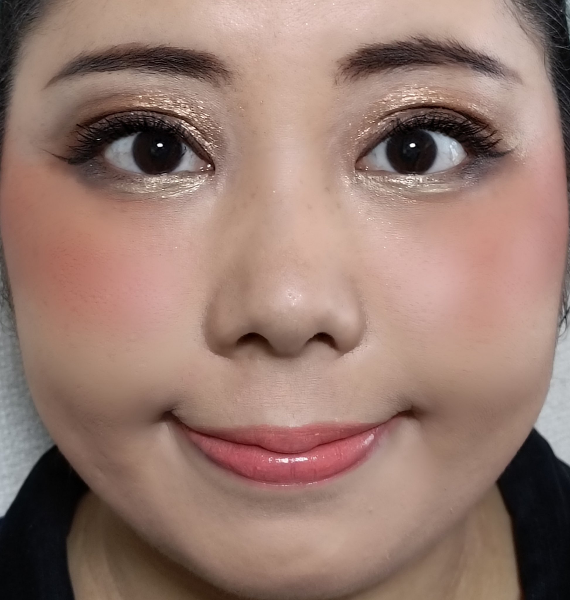 アイシャドウパレットは、UR GLAM アイシャドウパレットを、使用しました。 リップは、M・A・C リップスティック ピーチストックを、唇全体にまんべんなく塗ります。
