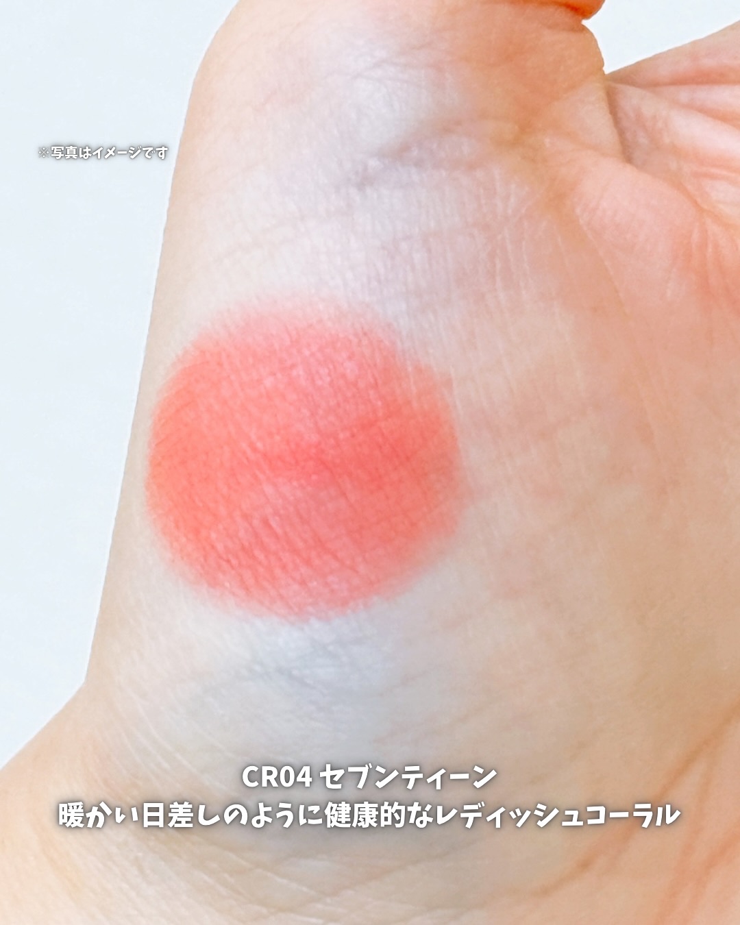 - <CR01 ディア> ダイメジメチコン、(ジメチコン/ビニルジメチコン)クロスポリマー、トリベヘニン、トリイソステアリン酸ポリグリセリル-2、リンゴ酸ジイソステアリル、合成フルオロフロゴパイト、二酸化チタン(CI 77891)、黄色酸化鉄(CI 77492)、カカオシードバター、ブルーアガベ葉エキス、セチルPEG/PPG-10/1ダイメチコン、イソステアリン酸ソルビタン、ビニルジメチコン/メチコンシルセスキオキサン)クロスポリマー、ポリヒドロキシステアリック酸、ジステアルジモニウムヘクトライト、パルミチン酸エチルヘキシル、ラウロイルサルコシン酸ナトリウム、アイソステアリック酸、レシチン、ジイソステアリン酸ポリグリセリル-2、ポリリシノレイン酸ポリグリセリル-3、クエン酸トリエチル、カプリリルグリコール、カプリル酸グリセリル、BG、精製水、香料、黄色5号(CI 15985)、赤色酸化鉄(CI 77491)、赤202(CI 15850)、黒色酸化鉄(CI 77499) <CR02 ボーイ> ダイメジメチコン、(ジメチコン/ビニルジメチコン)クロスポリマー、トリベヘニン、合成フルオロフロゴパイト、リンゴ酸ジイソステアリル、二酸化チタン(CI 77891)、トリイソステアリン酸ポリグリセリル-2、カカオシードバター、ブルーアガベ葉エキス、セチルPEG/PPG-10/1ダイメチコン、イソステアリン酸ソルビタン、ビニルジメチコン/メチコンシルセスキオキサン)クロスポリマー、ポリヒドロキシステアリック酸、ジステアルジモニウムヘクトライト、ジイソステアリン酸ポリグリセリル-2、パルミチン酸エチルヘキシル、ラウロイルサルコシン酸ナトリウム、アイソステアリック酸、レシチン、ポリリシノレイン酸ポリグリセリル-3、クエン酸トリエチル、カプリリルグリコール、カプリル酸グリセリル、BG、精製水、香料、黄色5号(CI 15985)、赤色104号(1) (CI 45410)、赤色酸化鉄(CI 77491)、赤202(CI 15850)、黄色4号(CI 19140) <CR03 ビーエフエフ> ダイメジメチコン、(ジメチコン/ビニルジメチコン)クロスポリマー、トリベヘニン、トリイソステアリン酸ポリグリセリル-2、リンゴ酸ジイソステアリル、合成フルオロフロゴパイト、二酸化チタン(CI 77891)、赤色104号(1) (CI 45410)、カカオシードバター、ブルーアガベ葉エキス、セチルPEG/PPG-10/1ダイメチコン、イソステアリン酸ソルビタン、ビニルジメチコン/メチコンシルセスキオキサン)クロスポリマー、ポリヒドロキシステアリック酸、ジイソステアリン酸ポリグリセリル-2、ジステアルジモニウムヘクトライト、パルミチン酸エチルヘキシル、ラウロイルサルコシン酸ナトリウム、アイソステアリック酸、レシチン、ポリリシノレイン酸ポリグリセリル-3、クエン酸トリエチル、カプリリルグリコール、カプリル酸グリセリル、BG、精製水、香料、黄色4号(CI 19140)、黄色酸化鉄(CI 77492)、赤202(CI 15850)、赤色201号 (CI 15850) <CR04 セブンティーン> ダイメジメチコン、(ジメチコン/ビニルジメチコン)クロスポリマー、トリベヘニン、リンゴ酸ジイソステアリル、トリイソステアリン酸ポリグリセリル-2、合成フルオロフロゴパイト、二酸化チタン、カカオシードバター、ブルーアガベ葉エキス、セチルPEG/PPG-10/1ダイメチコン、イソステアリン酸ソルビタン、ビニルジメチコン/メチコンシルセスキオキサン)クロスポリマー、ポリヒドロキシステアリック酸、ジステアルジモニウムヘクトライト、ジイソステアリン酸ポリグリセリル-2、パルミチン酸エチルヘキシル、ラウロイルサルコシン酸ナトリウム、アイソステアリック酸、レシチン、ポリリシノレイン酸ポリグリセリル-3、クエン酸トリエチル、カプリリルグリコール、カプリル酸グリセリル、BG、精製水、香料、赤色酸化鉄、赤色201号、黄色4号、赤色202号、黄色酸化鉄 <CR05 ガールズ> ダイメジメチコン、(ジメチコン/ビニルジメチコン)クロスポリマー、トリベヘニン、トリイソステアリン酸ポリグリセリル-2、合成フルオロフロゴパイト、黄色5号(CI 15985)、リンゴ酸ジイソステアリル、カカオシードバター、ブルーアガベ葉エキス、セチルPEG/PPG-10/1ダイメチコン、イソステアリン酸ソルビタン、ビニルジメチコン/メチコンシルセスキオキサン)クロスポリマー、ポリヒドロキシステアリック酸、ジイソステアリン酸ポリグリセリル-2、ジステアルジモニウムヘクトライト、パルミチン酸エチルヘキシル、ラウロイルサルコシン酸ナトリウム、アイソステアリック酸、レシチン、ポリリシノレイン酸ポリグリセリル-3、クエン酸トリエチル、カプリリルグリコール、カプリル酸グリセリル、BG、精製水、香料、黄色4号(CI 19140)、赤202(CI 15850)、二酸化チタン(CI 77891)、赤色201号 (CI 15850) <MV01 チリン> ダイメジメチコン、(ジメチコン/ビニルジメチコン)クロスポリマー、トリベヘニン、トリイソステアリン酸ポリグリセリル-2、リンゴ酸ジイソステアリル、合成フルオロフロゴパイト、酸化チタン (CI 77891)、赤色酸化鉄(CI 77491)、黄色酸化鉄(CI 77492)、カカオシードバター、ブルーアガベ葉エキス、セチルPEG/PPG-10/1ダイメチコン、イソス