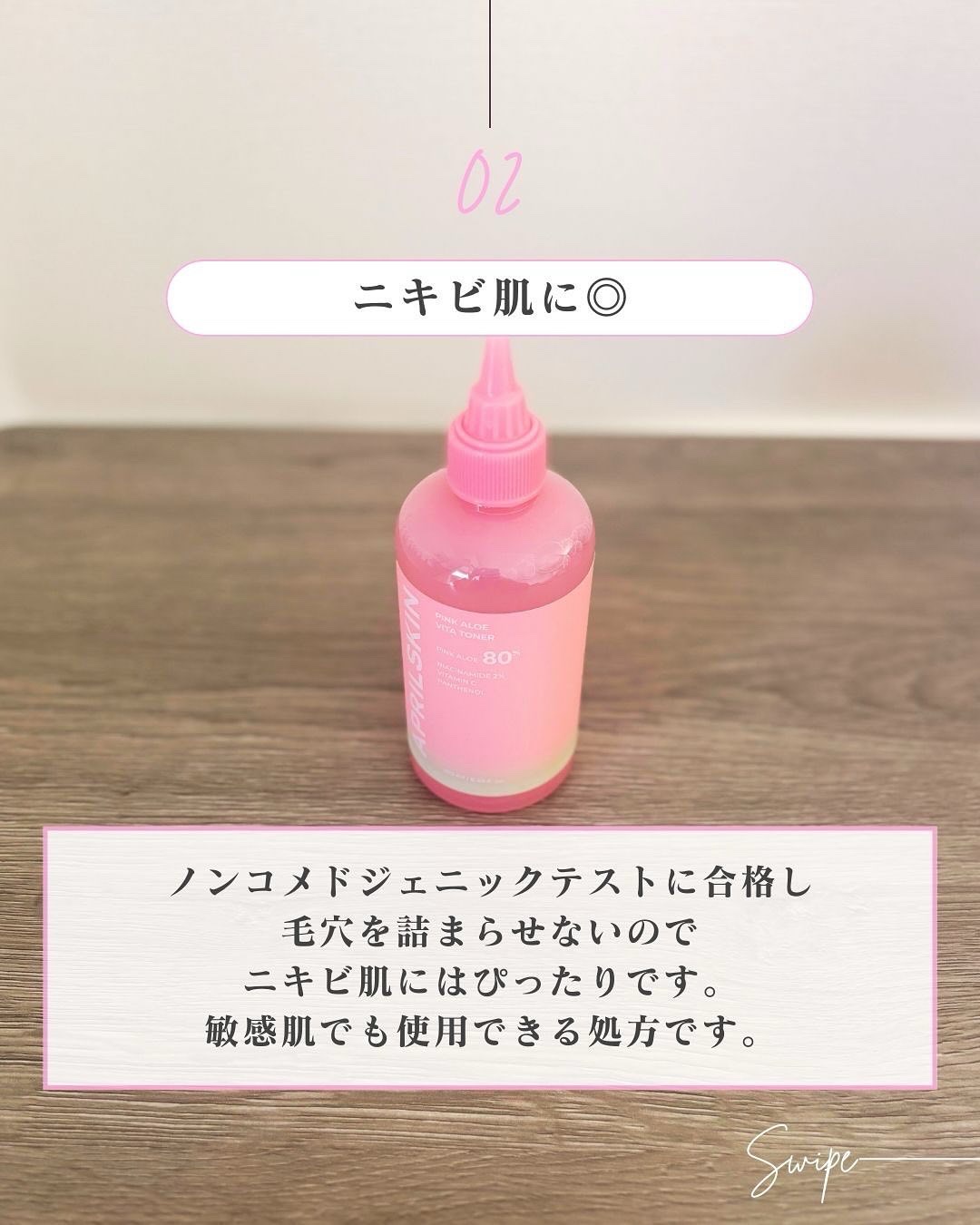ピンクアロエビタトナーはトラブル肌のために作られたさっぱり系トラブル鎮静トナー。 鎮静効果がより高いピンクアロエが80%配合! 拭き取り化粧水としてもクールダウンパックとしても使えるから肌の水分補給をして急速に鎮静が期待できるよ! ほんのりピンクのトナーで、さらっとしたテクスチャー! 塗るとぐんぐん浸透して乾燥してつっぱったも吸いつくようなもっちり肌に✨