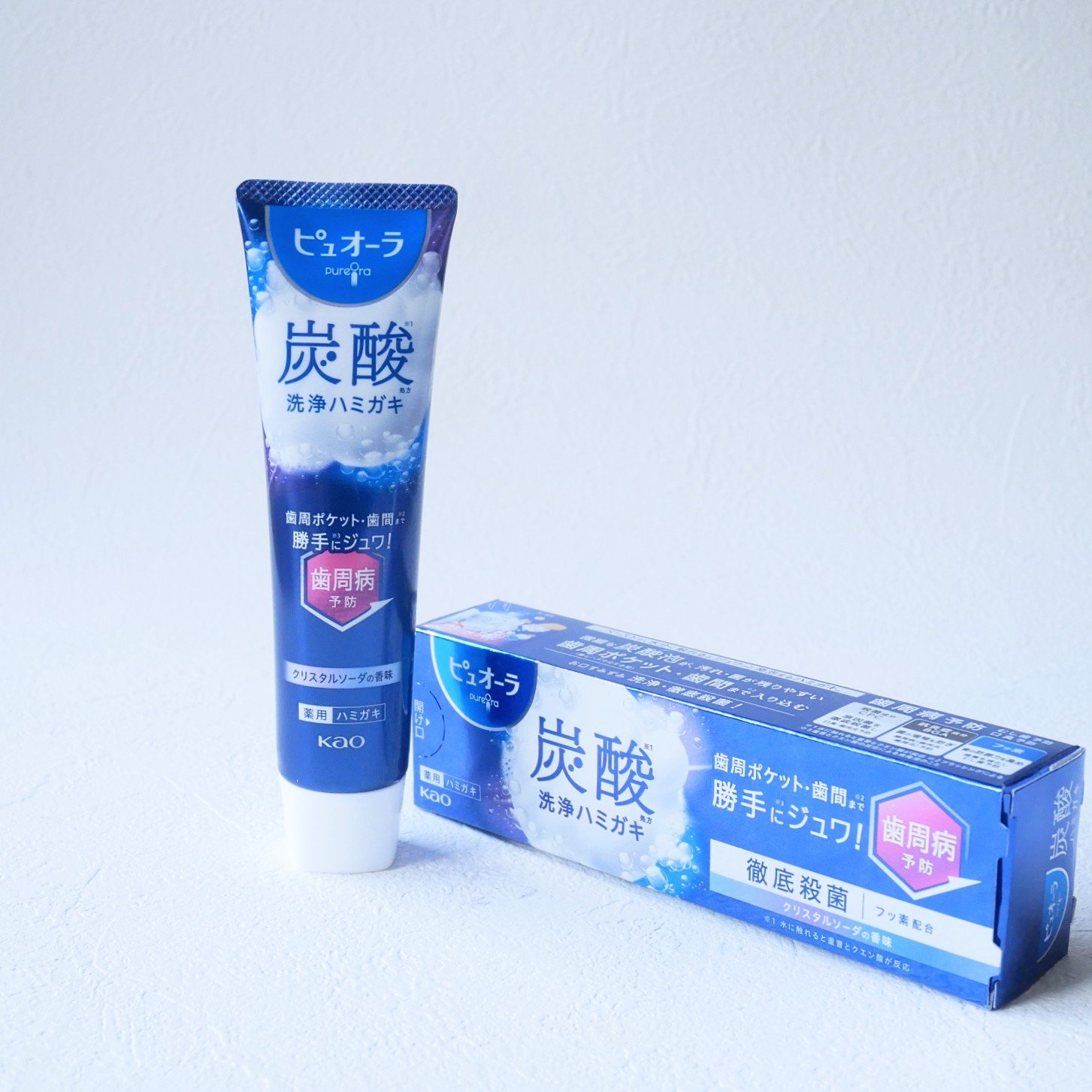 - ペーストが、水分に触れるとジュワっと発泡するハミガキ 炭酸*2泡が、歯周ポケット*3・歯間まで*4入り込む お口のすみずみまで洗浄・徹底殺菌 ・殺菌成分CPC*7 原因菌を徹底殺菌し、口臭・歯肉炎予防 ・抗炎症成分BGA*8 菌の増殖を防ぎ、歯周病*6予防 ・フッ素*9 歯の防御力を高め、歯質を強化し むし歯予防 ・クリスタルソーダの香味 *2 水に触れると重曹とクエン酸が反応 *3 歯とハグキのすき間のこと *4 ブラッシングによる *7 CPC(塩化セチルピリジニウム) *8 BGA(β-グリチルレチン酸) *9 フッ素(モノフルオロリン酸ナトリウム)