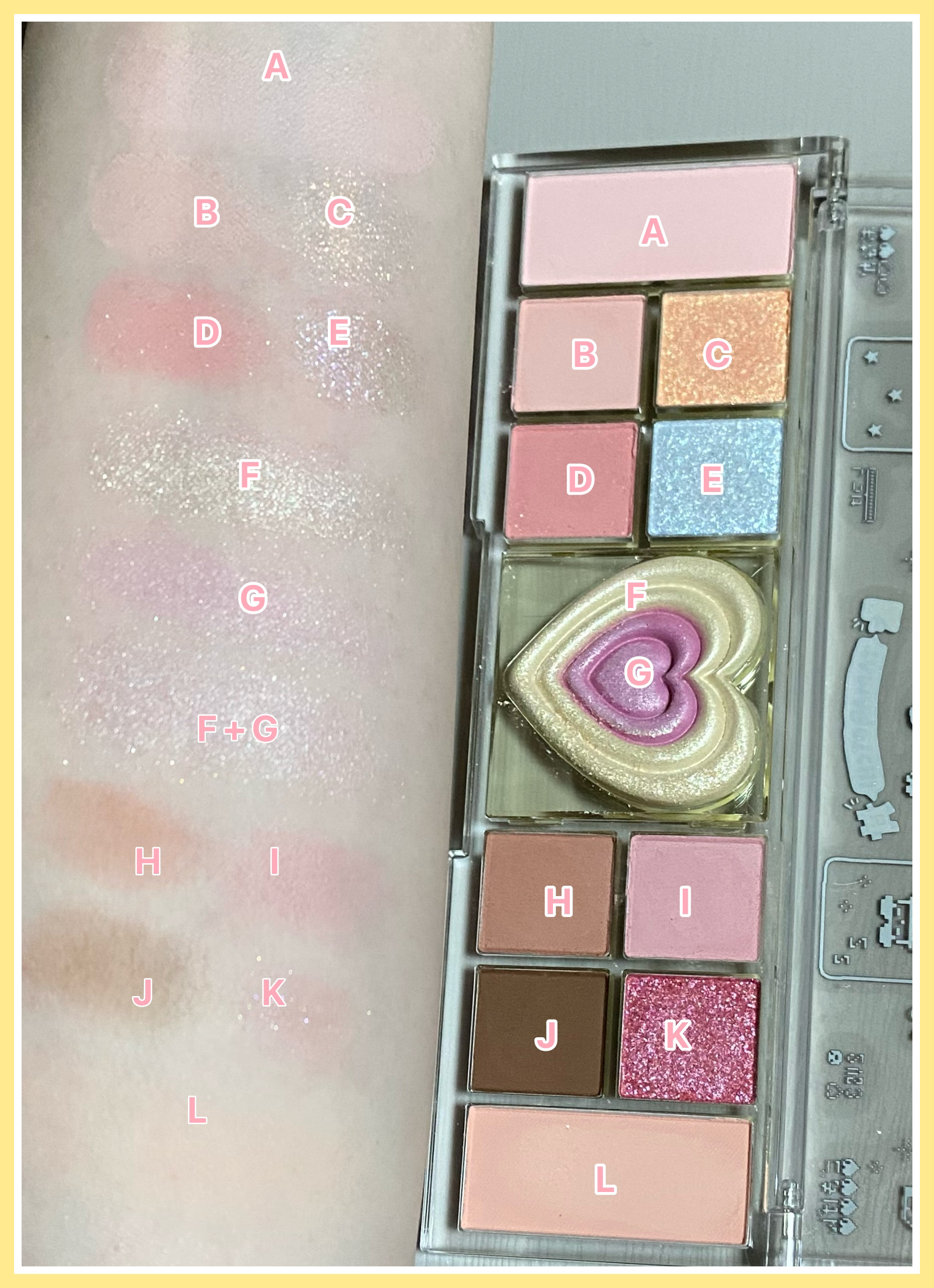 - シャドウ+チーク+ハイライター=自由自在♡ パレット1つで多彩なメイクを楽しんじゃお♥ その日の気分やファッションに合わせてメイクアップ可能! なりたい自分、理想のメイクが楽しめるパレット!誰でも簡単に自分だけのムードが作れる! <01 プレステージ ピンク(PRESTIGE PINK)> 無邪気な可愛らしさ満載のピンクパレット 立体的なハート型のハイライターが透明感を引き立てる! <02 ピーチ ヘブン(PEACH HEAVEN)> ナチュラルで肌馴染みのよいピーチパレット 立体的なハート型のハイライターが透明感を引き立てる!