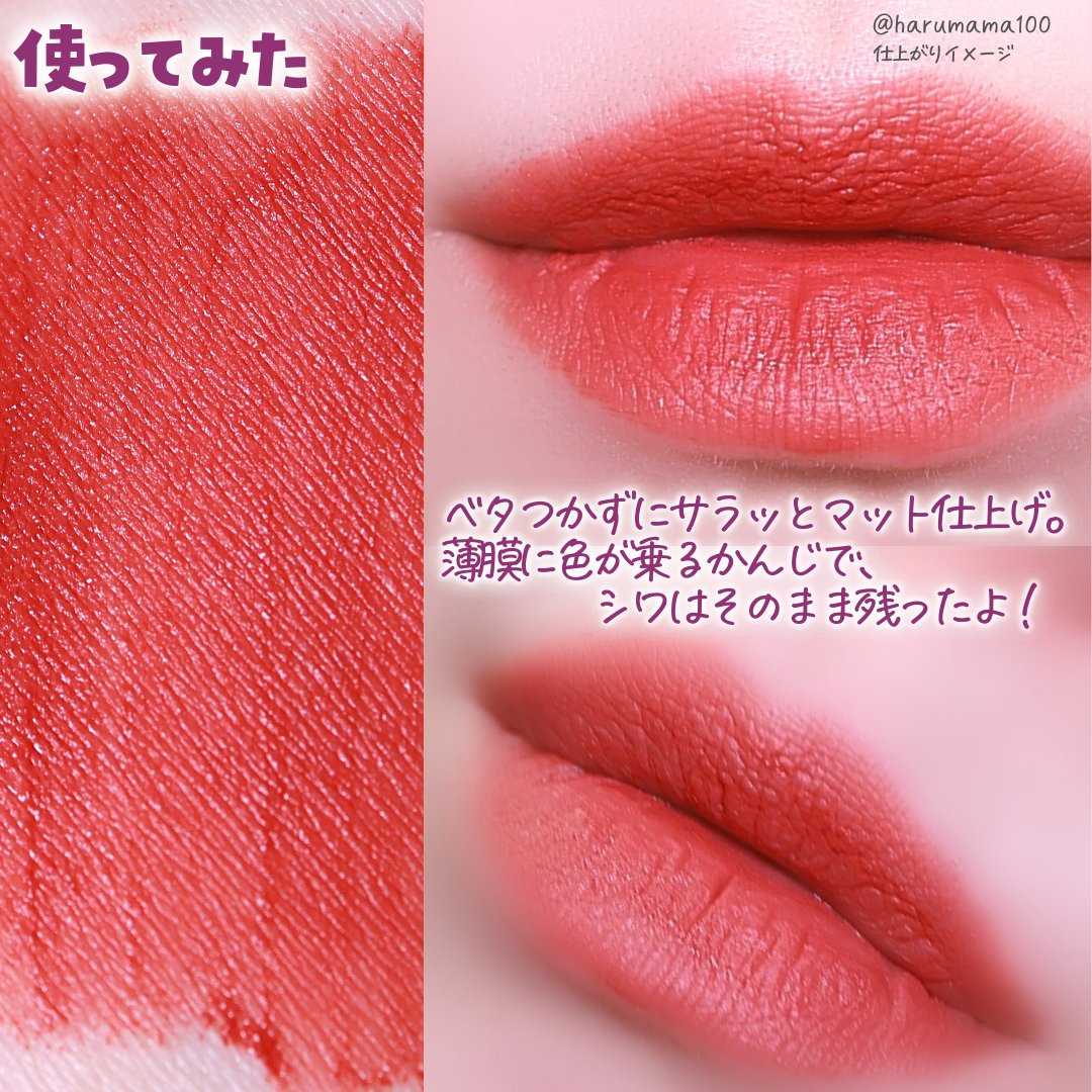 く、首が…(笑) 開き方はまぁ、ちょっとあれですけど見た目はすっごく可愛いです🫶🏻️ ̖́-❤︎ マットタイプって乾燥しやすいらしいので使うのにコツがいりそうですね…。