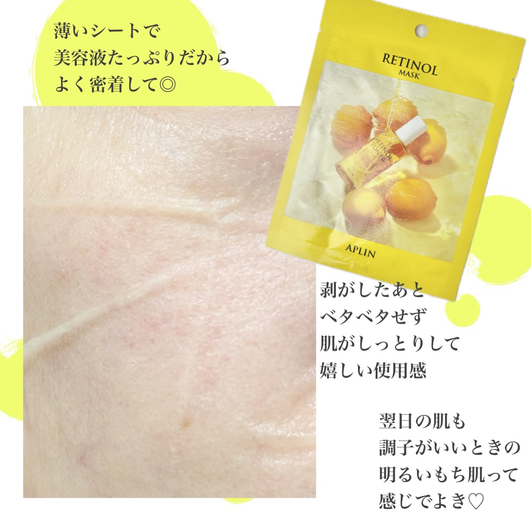 APLINからいつの間にか出てた黄色パケが目印のレチノールマスク💛 主成分に レチノール、ヒアルロン酸、ビタミンCまで! 試しに使ってみたらほんとになんか肌がもちっとしてる感じがして、肌の調子もいい感じがして、ココ最近使ったマスクの中で一番いい! マスク自体も薄くて密着力高めでかなり使いやすいし、美容液もひったひた!