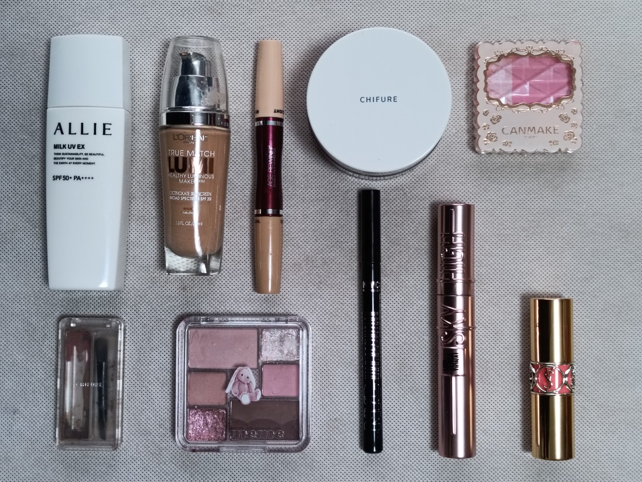 アリィー ニュアンスチェンジUV ジェル RSを、顔全体にまんべんなく塗ります。 RMK RMK ジェルクリーミィファンデーション 103を、顔全体にまんべんなく塗ります。 ジョンソンベビー ジョンソン ベビーパウダーを、顔全体にまんべんなく軽くはたきます。 THE BODY SHOP bronze shade warm glowを、両頬に塗ります。 KATE リフレクトミラーアイズ BR-1の締め色を、眉毛全体にまんべんなく塗ります。 URGLAM UR GLAMBLOOMING EYE COLOR PALETTE 01を、使用しました。 ちふれ リキッド アイライナー 筆ペンタイプ BK30 ブラックを、塗ります。 CEZANNE エアリーカールマスカラを、まつ毛全体にまんべんなく塗ります。 MAYBELLINE NEW YORK コロッサルボリュームエクスプレスを、まつ毛全体にまんべんなく塗ります。 MAYBELLINE NEW YORK SPステイ マットインク 135を、唇全体にまんべんなく塗ります。