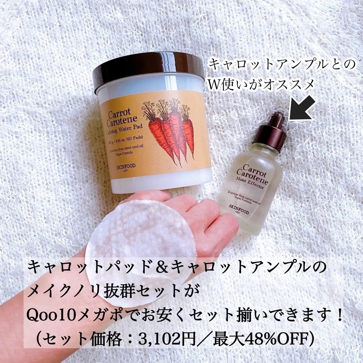 メイクノリ抜群セットがQoo10メガポでお得に買える💓(セット価格:3,102円 / 最大48%OFF!) 韓国オリヤンで1位獲得の『キャロットパッド』🥕 厚手のふわふわパッドは、忙しい朝の拭き取りケアや半分に割いて部分パッドもできる✌︎ みずみずしく肌にうるおいを与えて乾燥肌の私も満足の仕上がり👌🎶
