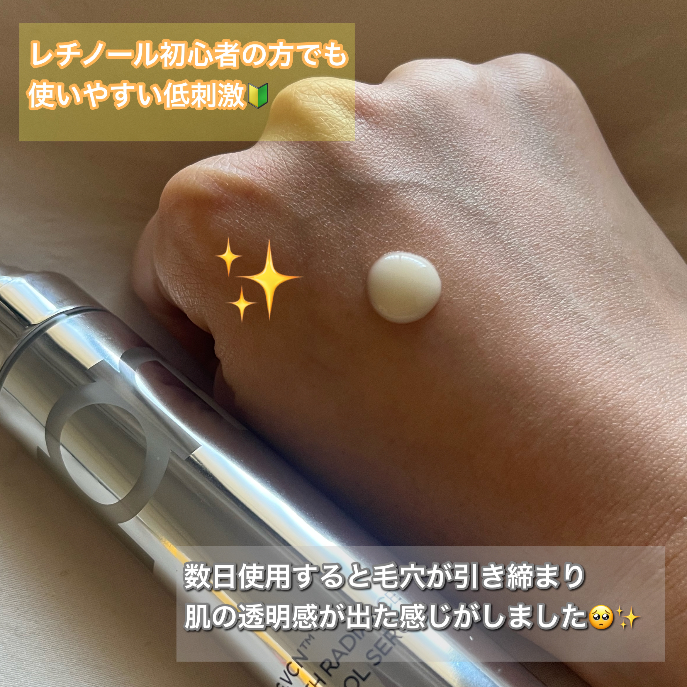 シルバーのボトルは、とってもオシャレ カプセルパートとセラムパートで分かれているのでふたを開け、カチッと音がするまでポンプを押し、最初に使用するときは、カプセルが溶けてセラムとよく混ざるように30秒以上、上下に振り、5分ほど立てておき、お肌になじませます。 ビタミンC+レチノールを実現したセラムはビタミンCカプセルとピュアレチノールの革新的な組み合わせで、毛穴や弾力などの肌の状態をケアし、健康的で美しい肌へと導くことができます。 やっぱり、別々に使ってたビタミンCとレチノールが一緒に使えるのはうれしい!