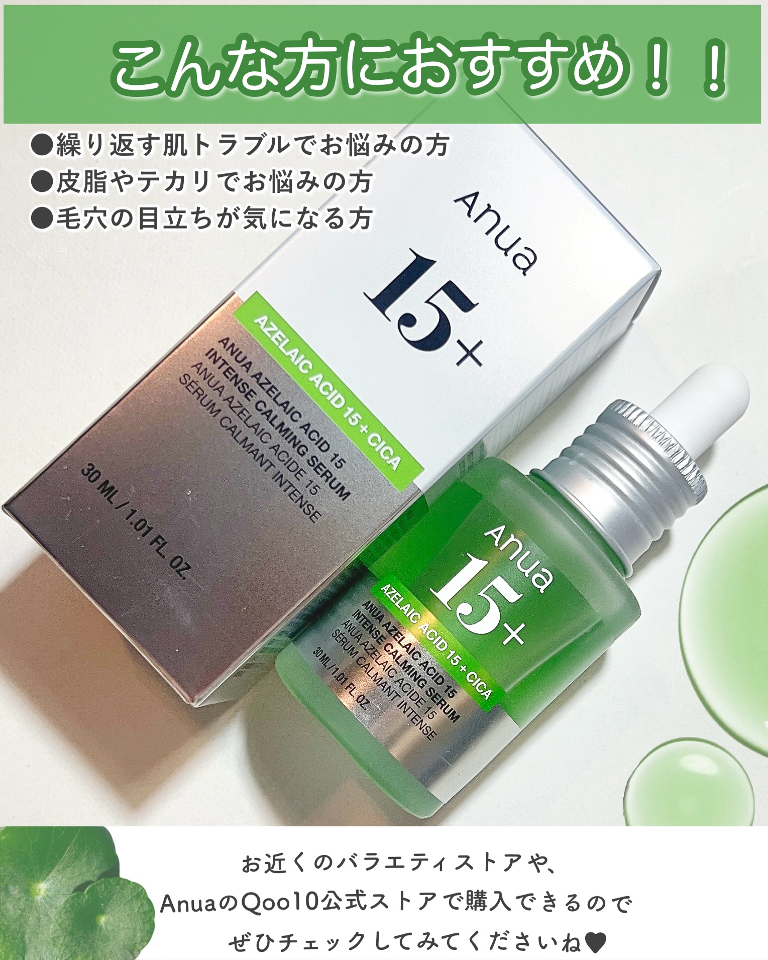 Anua 様の商品を紹介します‼︎★アゼライン酸15インテンスカーミングセラム抗炎症やアクネ菌の増殖防止に効果があると言われている今話題の成分アゼライン酸配合のセラムです‼︎ニキビや過剰皮脂を抑えると共に7つのシカコンプレックス成分で赤くなっ...
