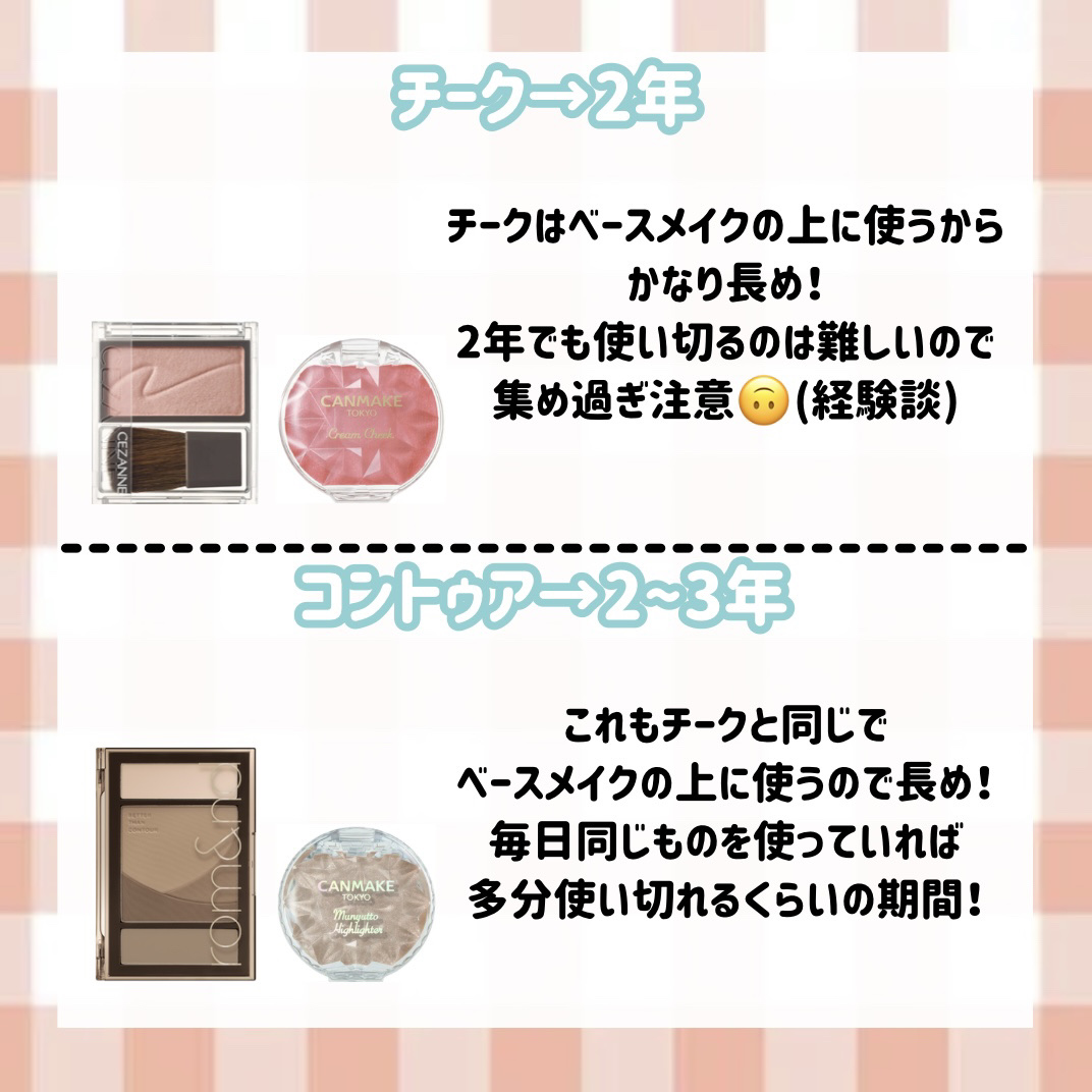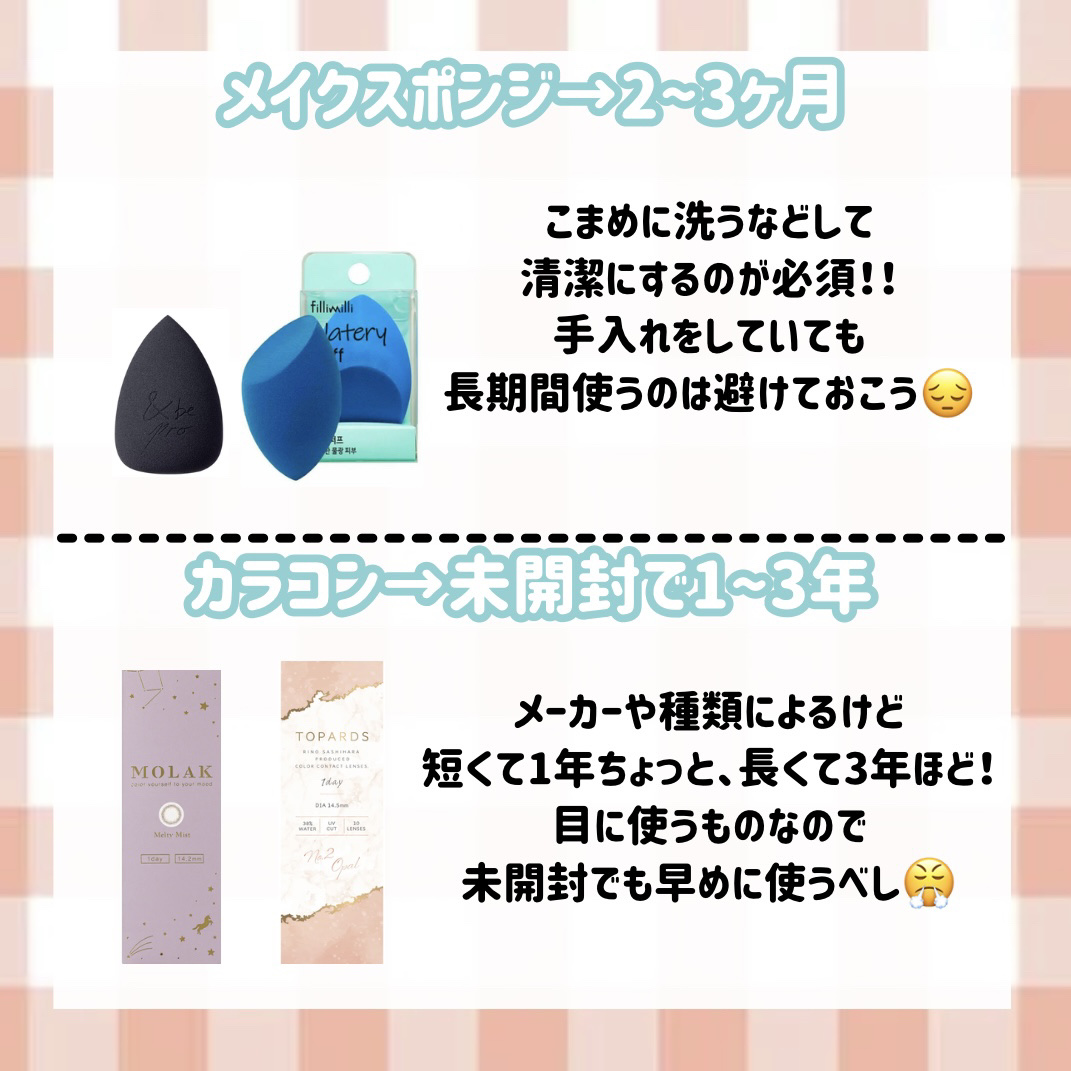 使用期限を守らないことで雑菌や増えていたり、肌によくないものに変わってしまっていたりいます… アイライナーやマスカラは特に放っておくと目の粘膜が炎上してしまったり、感染症の感染にも繋がるのでお気をつけください😱 〇スキンケア用品全般⋯3~6ヶ月 1シーズンで使い切るのが良いとされる