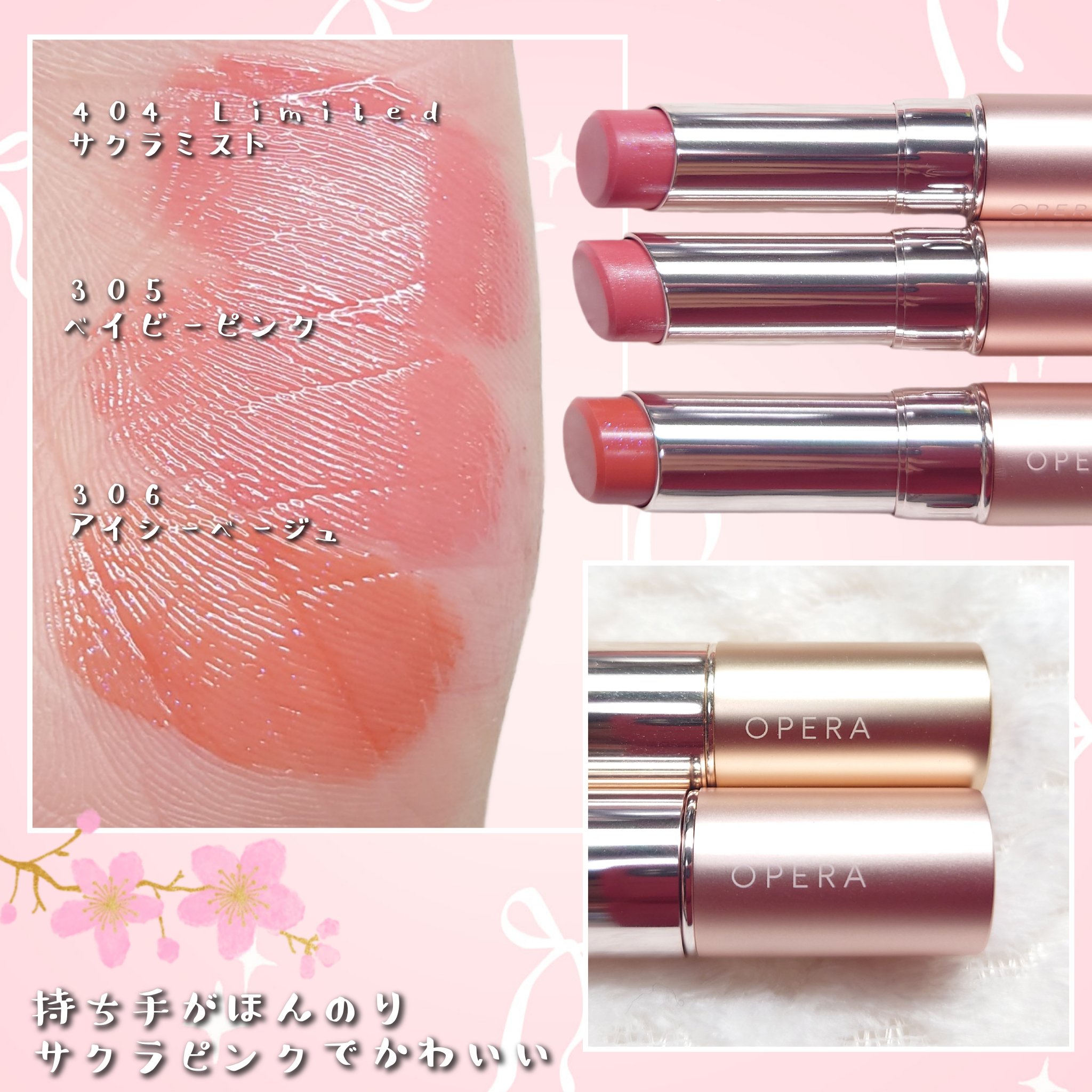 OPERAの新作桜リップ🌸🩷305ベイビーピンク🧡306アイシーベージュ・305ベイビーピンクシルバーラメがチラチラ輝くリップ・306アイシーベージュブルーラメがアクセントのリップ大好きなオペラのリップの春限定&新色🌸今回はイエベカラー2種を...