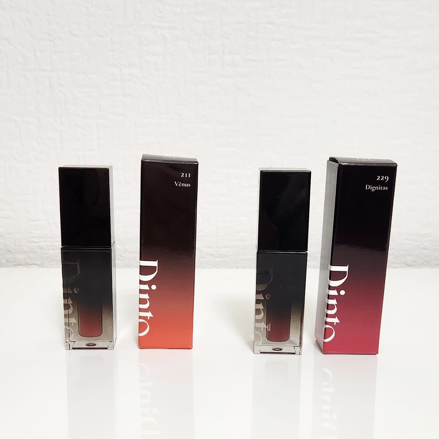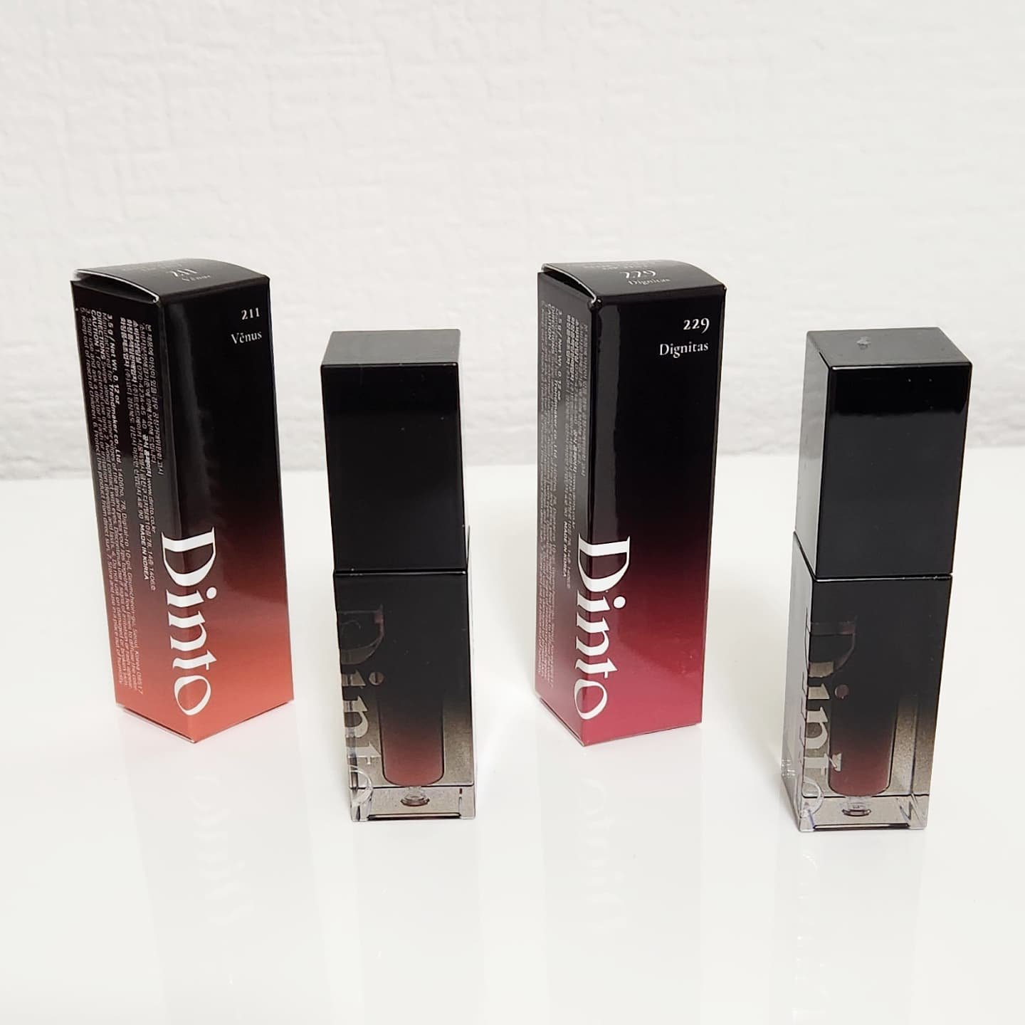 しっとりとした光沢感とべたつかないつけ心地、塗った直後にティッシュオフしても残る色味、絶妙なカラー展開が魅力のDintoティント♡ 221 Temet Nosce アッシュなモーヴピンク。青みと白みのバランスがかっわいいお気に入りカラー 229 Dignitas ダスティーローズ。そんなに深みはなくてちゃんと血色感の出るカラー。