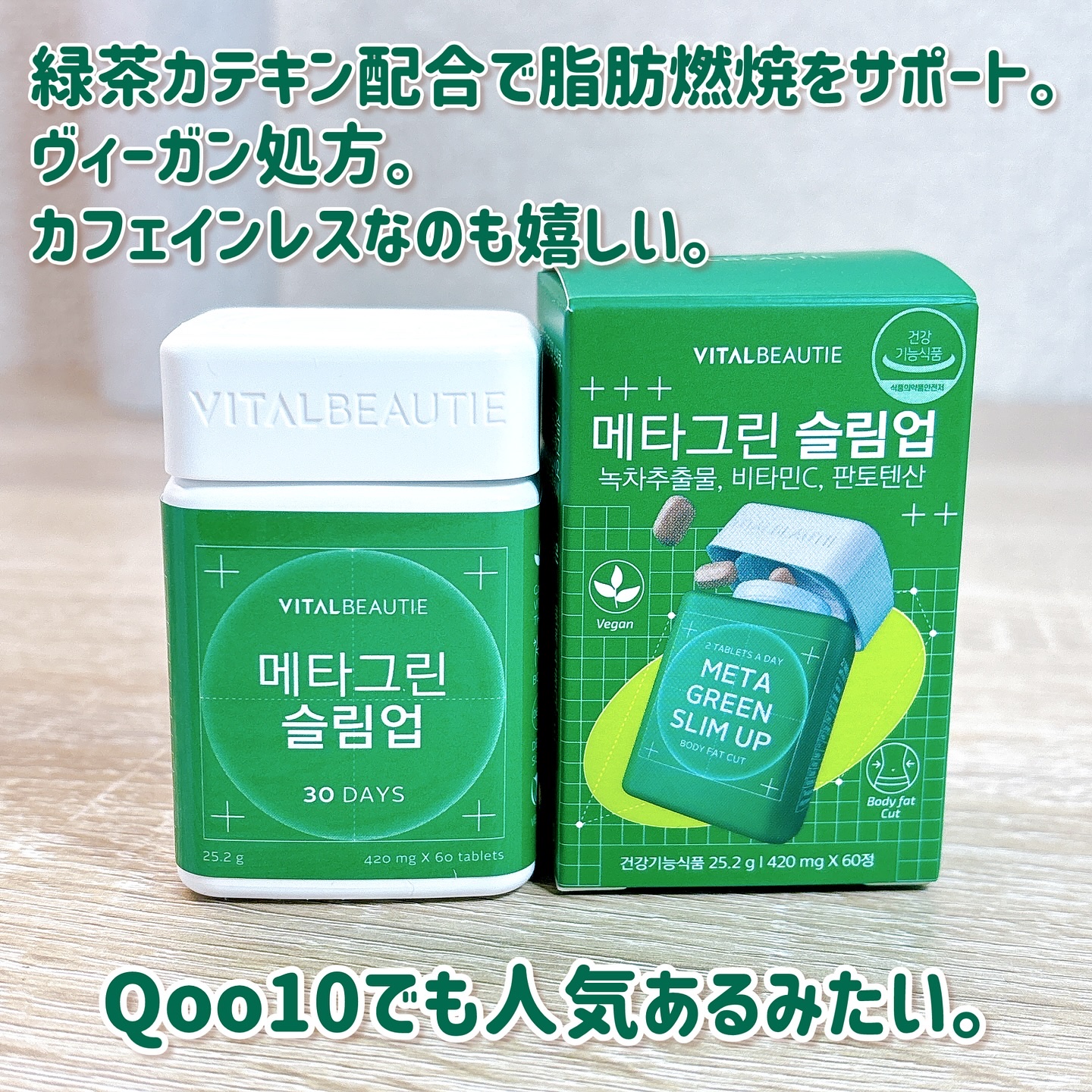 ✿バイタルビューティー✿メタグリーンスリムアップ30日分オリーブヤング健康機能食品1位*を獲得した脂肪燃焼サプリ💊体脂肪の減少を手伝ってくれる緑茶カテキンが高配合されていて、食事後の脂肪の吸収を抑えて排出を手伝ってくれる商品✨️食後に1日2粒...