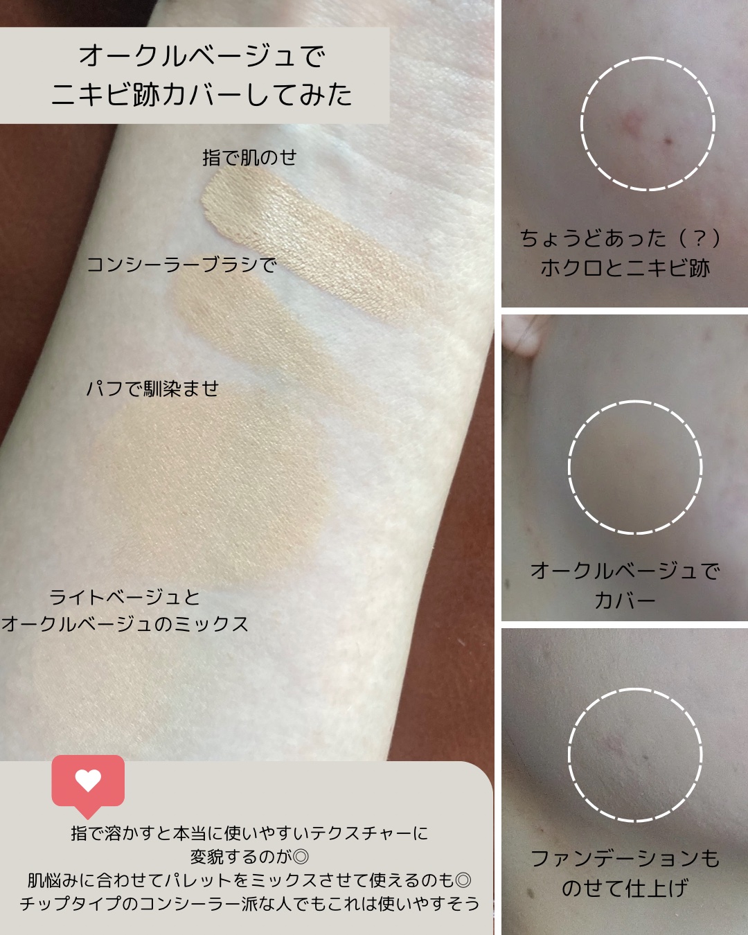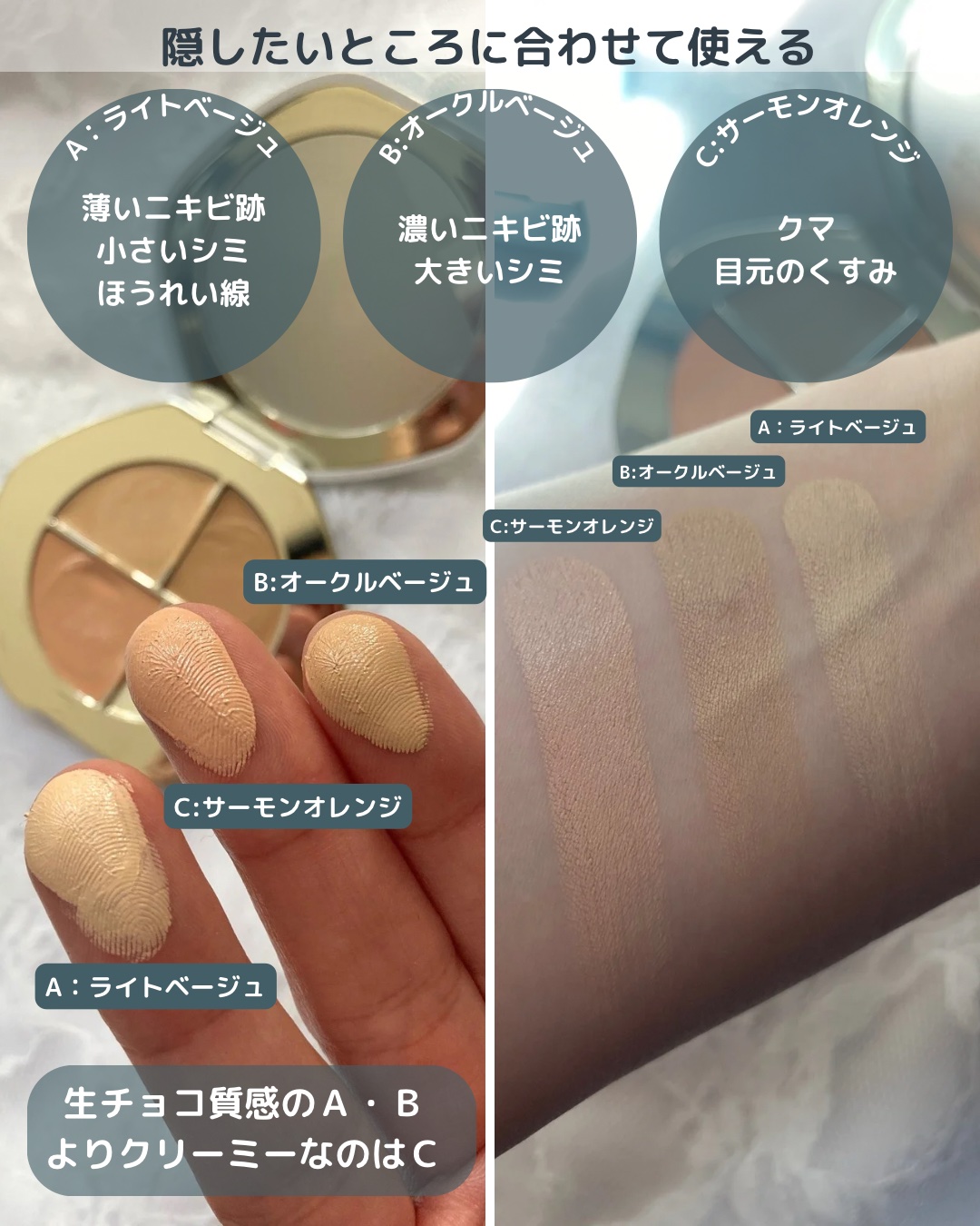 点悩みも面悩みも両方いける コンシーラーパレット🎨 質感の違う3色がセットされてるの🎨 ☑︎AライトベージュとBオークルベージュは生チョコの質感 柔らかくて肌との密着性に優れしっかりカバー さらにこのパレットの良いところは右下にミックススペースがあって混ぜて自分に合った色を作ったりできるの🫶