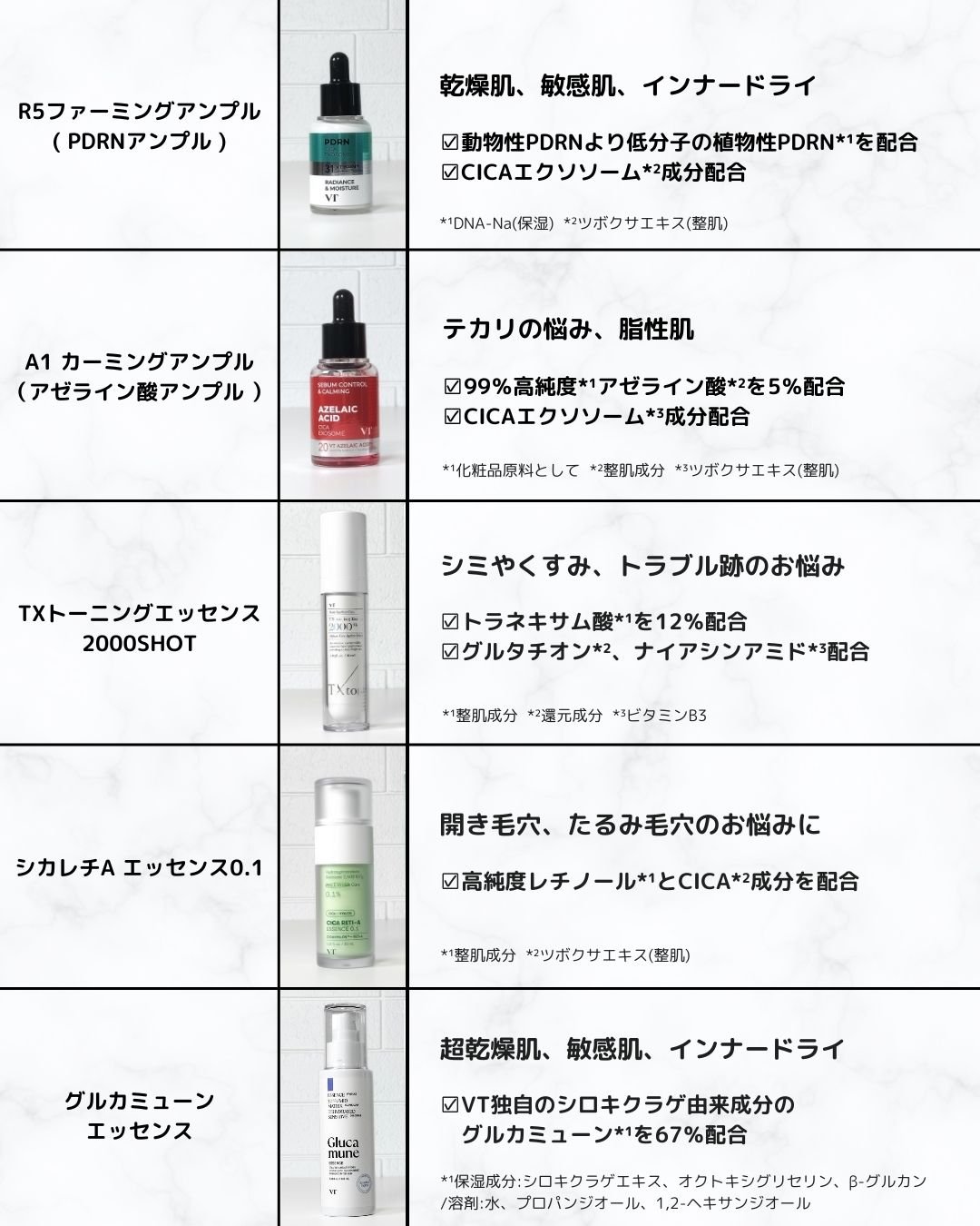 VT(ブイティー)の美容液5種類を比較🤍🌿🖤R5ファーミングアンプル動物性PDRNより低分子の植物性PDRN+CICAエクソソーム成分配合。 肌荒れ予防とツヤ肌を目指すならこれ。乳白色。なめらかな使用感。[おすすめ肌悩み]ニキビ跡、インナード...