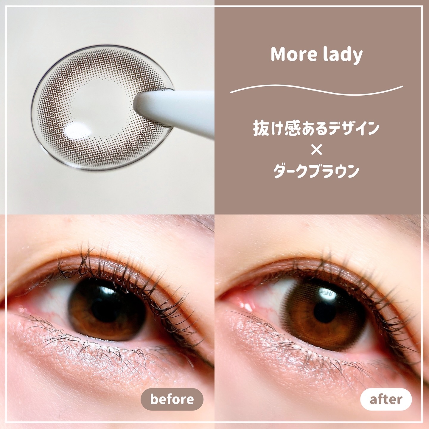 じゅわっと甘くて甘くて色っぽいムード漂うかけひきレンズ。 着け心地よくてドライアイにもおすすめだよ👀✨ 「Darling fig」 モーヴグレー×ちゅるん細フチで透明感ゲット🩶 「More lady」 ダークブラウン×うるふわフチでくりっと抜け感🤎