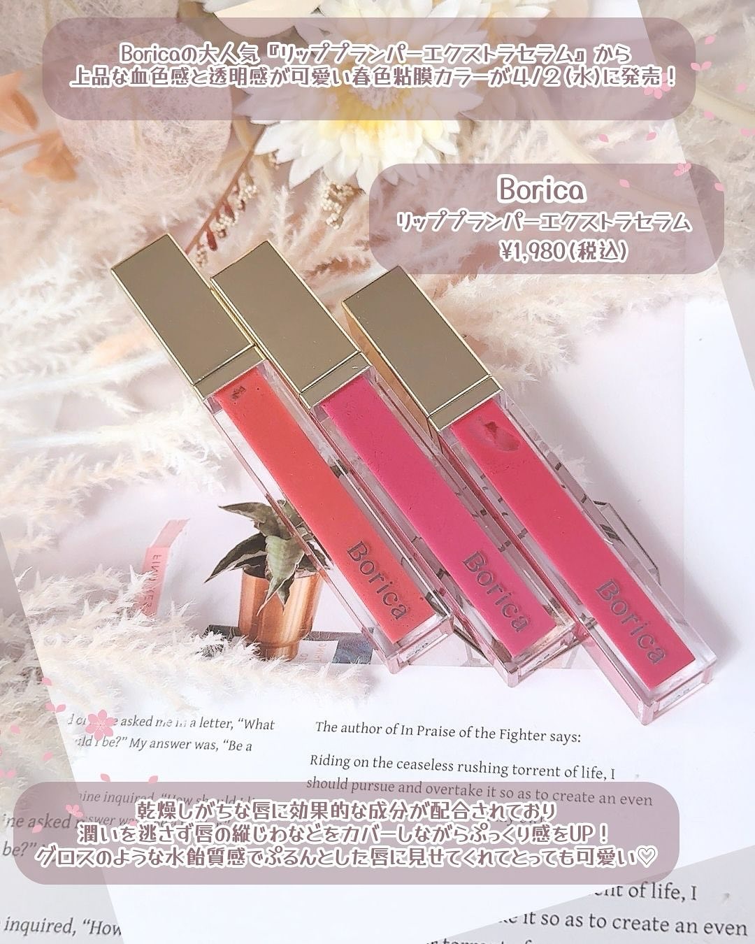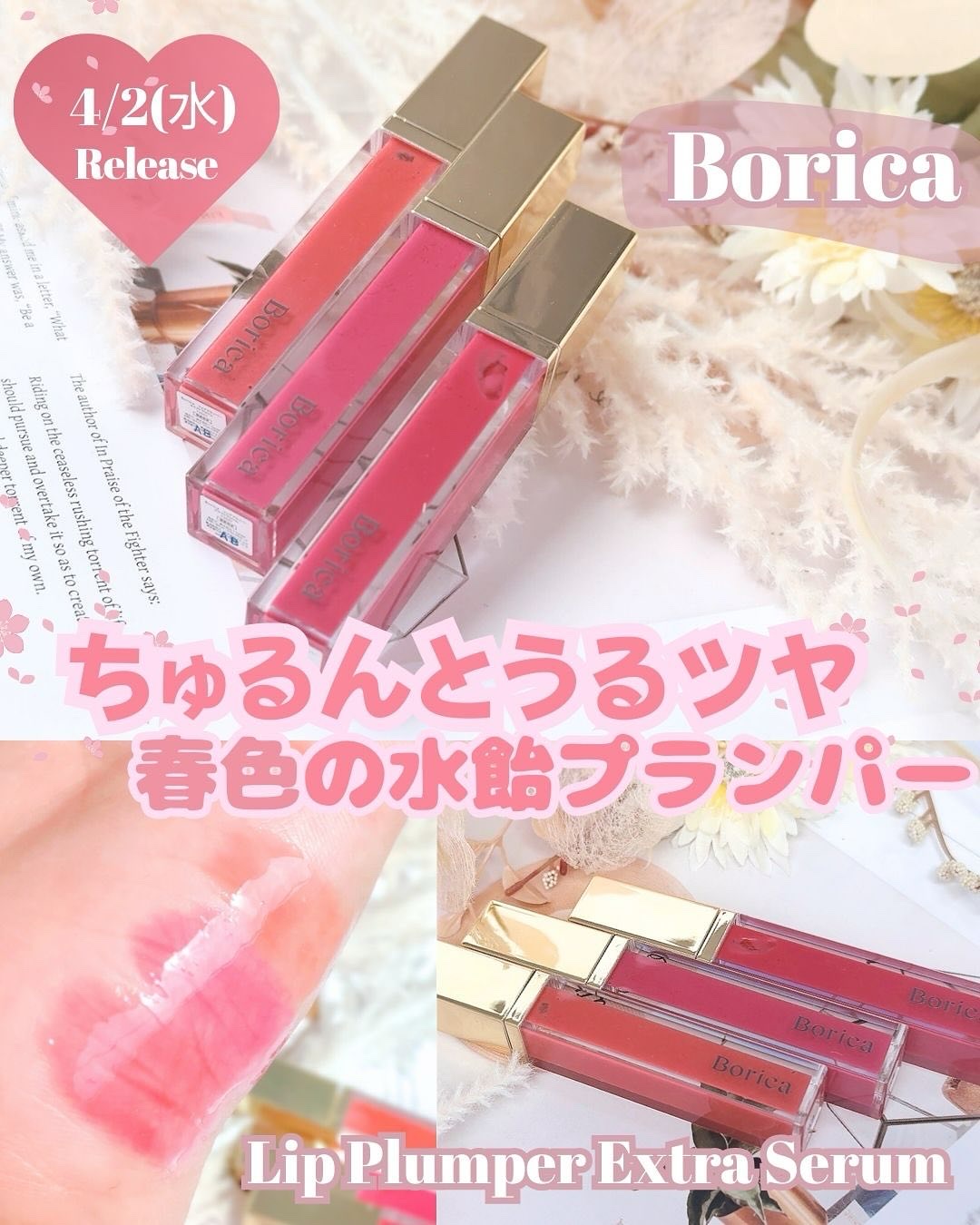 Boricaの大人気リッププランパーから新色登場💗💗春色粘膜カラーが4/2(水)登場🪄✧Boricaリッププランパーエクストラセラム205ハニーポメロ206ピュアベリー207プラムジェリーとろけるようなむっちりテクスチャーとマイルドなピリピリ...