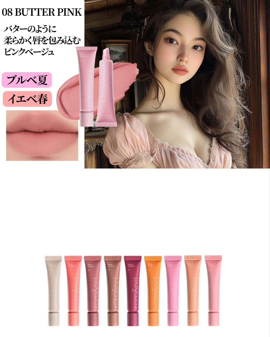 rom&ndカラーリップマットロムアンドからチューブタイプのマットリップ🎀パテみたいなふんわりテクスチャーで軽いつけ心地☁️単色使いはもちろんザジューシーラスティングティントを重ねても可愛い💋プライマーが縦じわを目立たなくしてキレイな仕上がり...