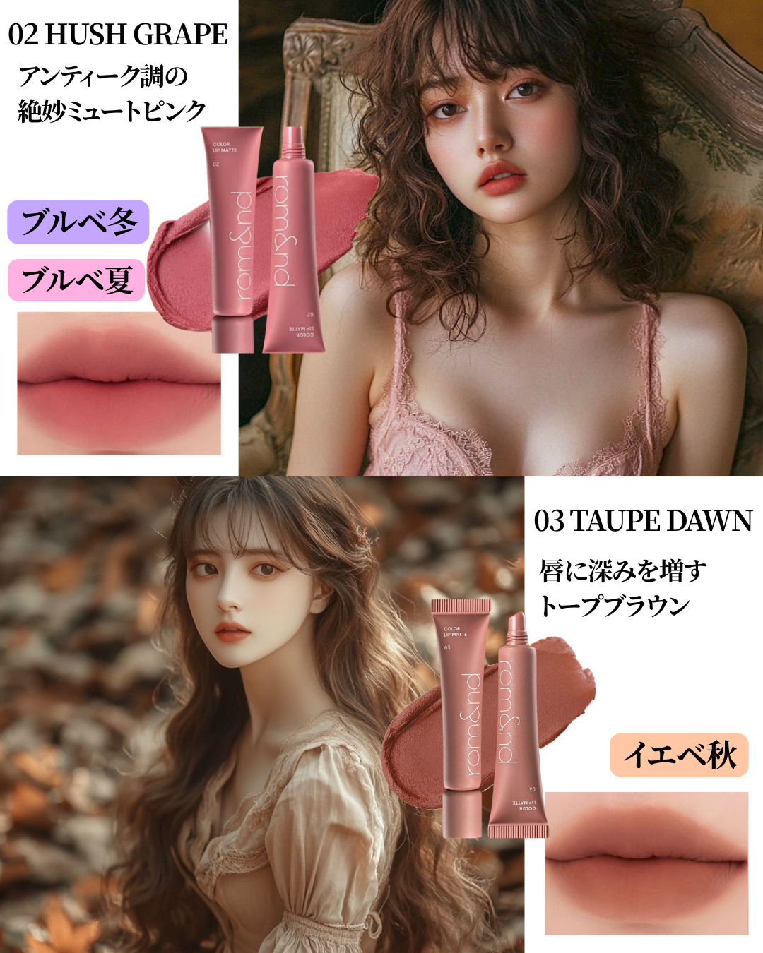 - これまで数々の人気リップを手掛けてきたrom&ndから、リッププライマーにカラーを加えた、新感覚「カラーリップマット」が登場。 チューブタイプで使いやすく、唇の縦ジワをカバーしながらふんわりと色づく、軽やかなマットリップです。1本でナチュラルに仕上げるのはもちろん、お手持ちのリップの下地としても使える万能アイテム。チークにも使えるので、流行りのリップ&チークアイテム として統一感のあるメイクに仕上がります。
