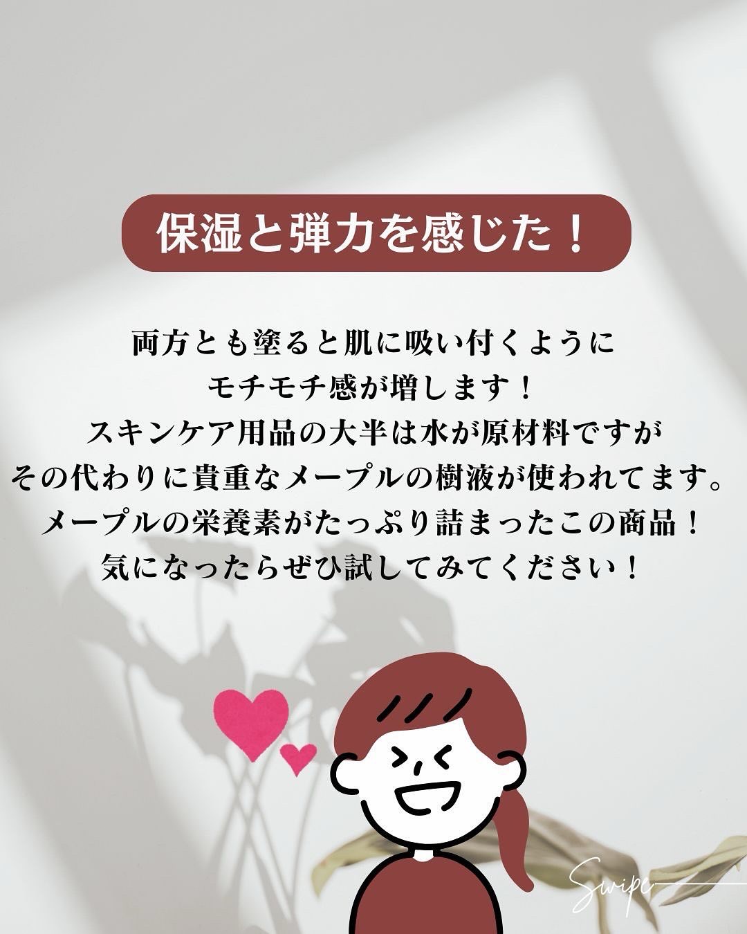 メープル樹液を55%配合!とろみのある美容液ですが、肌になじみやすい べたつきはないから気持ちよく使えて肌がしっとり✨✨ メープル樹液を52%以上配合!こっくりとしたテクスチャーですが肌に伸ばしやすく、なじみやすい。 時間が経っても乾燥しがちな頬がふっくらのままよりハリが増したような感じがします。