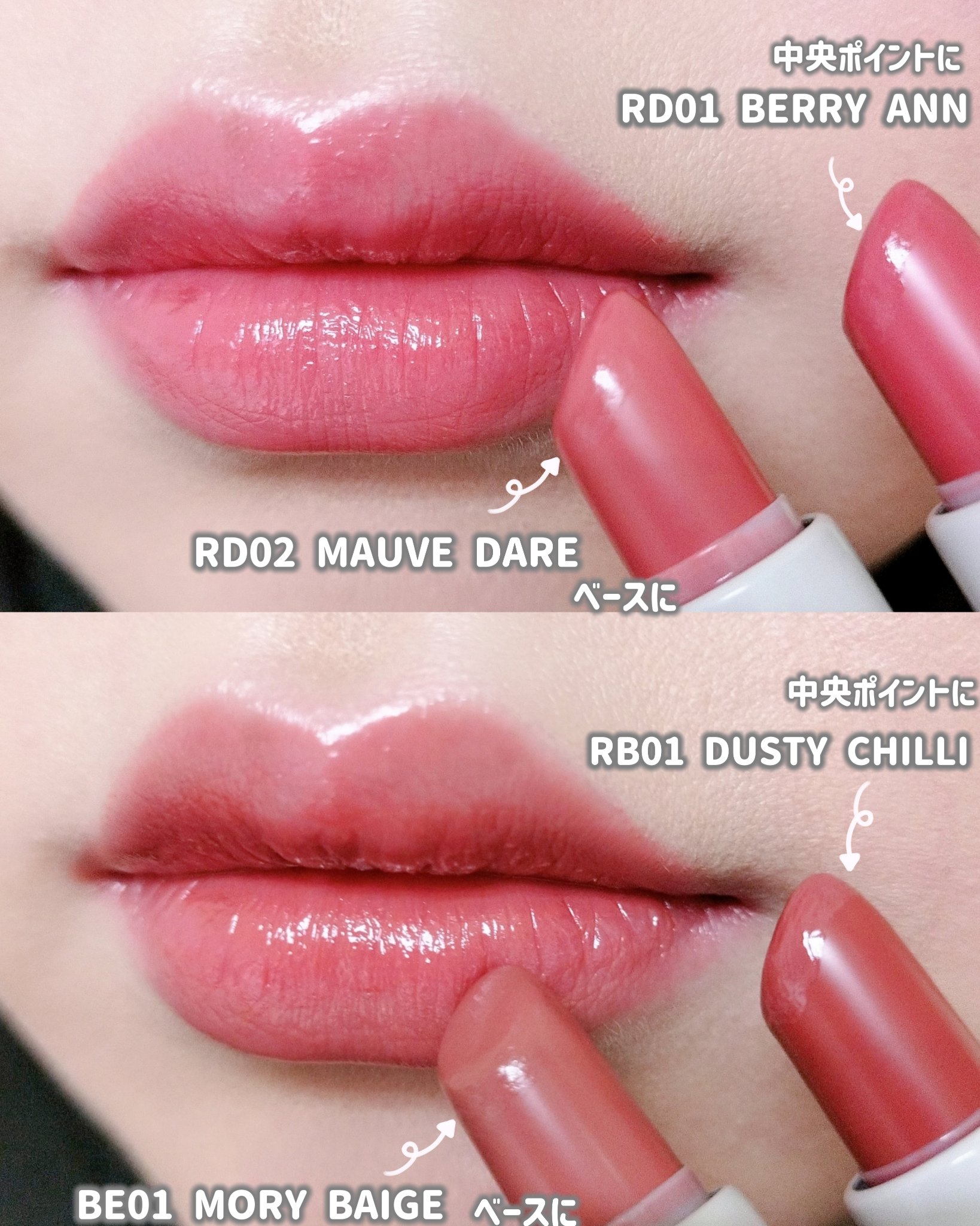 🍑21→ピンクにやや赤っぽい。普段のメイクに合わせやすい。 🍑22→コーラルだけどオレンジ寄り。ヘルシーな感じ。夏場たくさん使いたい。 🍑23→ピンクにやや黄色がかってる。割とナチュラルなので21と同様に普段使いしやすい色。 🍑24→コーラルだけど私の中では赤リップ扱い 🍑25→ショッキングピンク蛍光色なので派手な印象。 塗りたては潤ってるけど、次第に質感はマットに。 なめらかでやや滑る。生クリーム10分立て?より、もっと濃縮したのを塗ってる感じ。 香りは桃だと思う!!(副鼻腔炎で、鼻に自信がない笑) 乾燥しすぎな唇なので、先にリップクリーム塗ってから塗ることにしてます。縦じわは気になるかも…?私は気にしてないです。