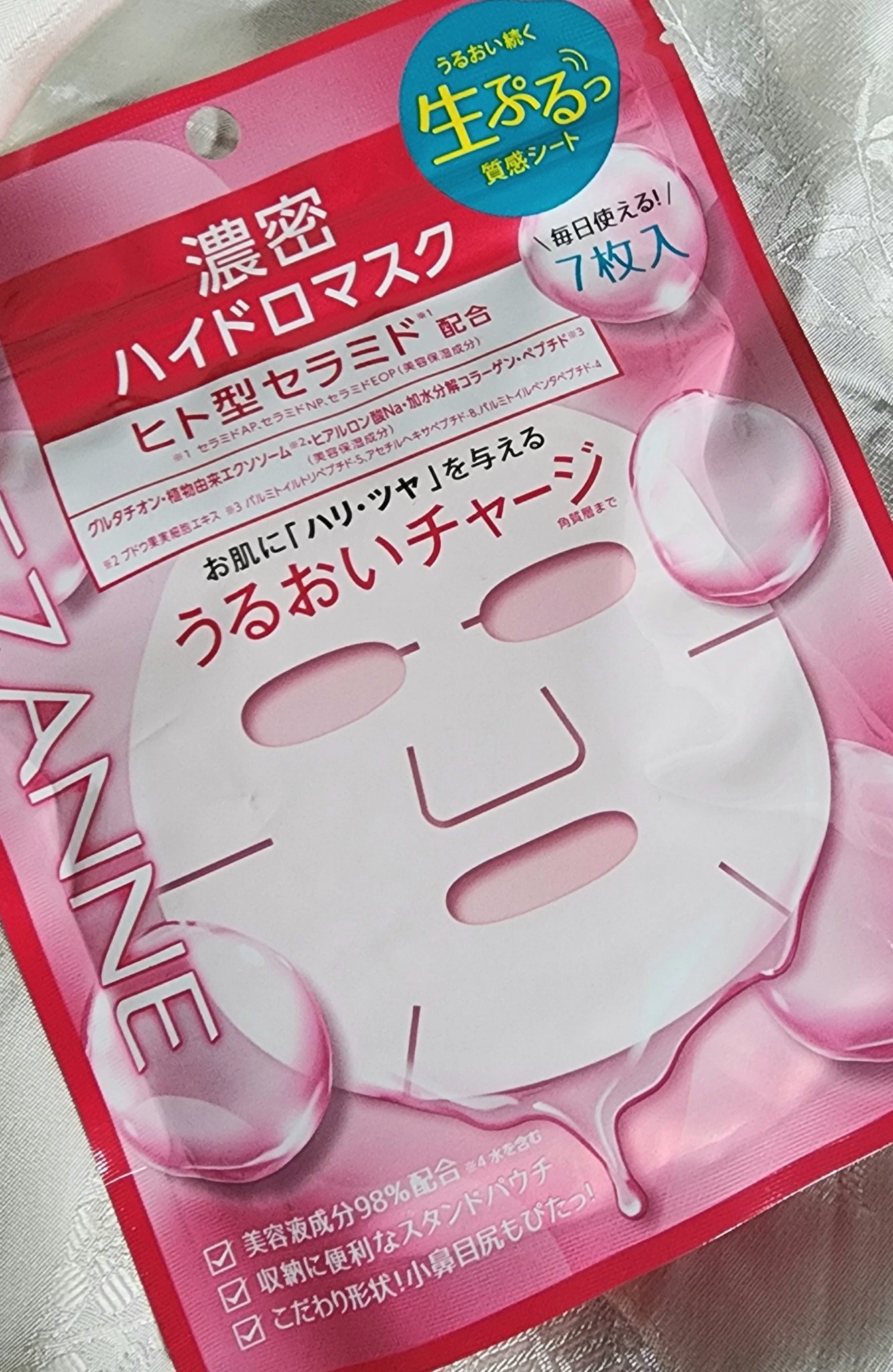 - 生ぷるっ質感の高保湿シートマスク。 うるおい続く「生ぷるっ」高密着シート。美容液をたっぷり含んだぷるぷるなシートはまるで貼る美容液!?乾燥しにくく、はがれにくい。 3種のヒト型セラミド※1と5種の美容保湿成分(植物由来エクソソーム※2、加水分解コラーゲン、ペプチド※3、ヒアルロン酸Na、グルタチオン)配合。 ※1 セラミドAP、セラミドNP、セラミドEOP(美容保湿成分) ※2 ブドウ果実細胞エキス ※3 パルミトイルトリペプチド-5、アセチルヘキサペプチド-8、パルミトイルペンタペプチド-4 目尻、目の下のキワまで密着し、小鼻もしっかりカバーするピタッとスキなし形状。 使用方法 袋のチャックを大きく開口して、1枚ずつ取り出してください。シートマスクを広げるときは、手のひらの上で丁寧に広げてください。手に残った美容液は全身にご使用いただけます。お顔に合わせて密着させ、3分程度おいてください。マスクを外し、お肌に残った美容液をなじませてください。 ※美容液をたっぷり含んだシートマスクになっています。液だれにご注意ください。