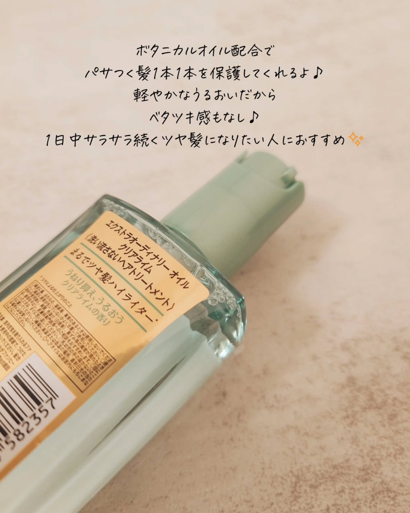 - #深呼吸したくなるヘアオイル ライムで、惹きつける。 髪そよぐたび、透きとおるツヤ感 ①大人気フレグランス、待望の定番化! かつて限定発売で大好評を博した爽やかなライムの香りが、多くのお客様からの熱いご要望にお応えして、ついに定番化。 ②みずみずしいライム&ミントの香り 付けた瞬間ふんわり香るライムとミントで、ヘアケアタイムを心地よく。 動くたびに、爽やかな香りが広がります。 ③ボタニカルオイル*¹配合、一日中²続く、さらツヤ髪へ パサつく髪1本1本を保護し、軽やかなうるおいが持続。 1日中*²サラサラ続くツヤ髪に。 *1 セイヨウハッカ油、レモン果皮油(全て保湿成分) *2 当社調べ。個人差があります。 2025年03月29日、定番化に伴い商品名が「ロレアル パリ エルセーヴ エクストラオーディナリー オイル フレッシュライムの香り」から「ロレアル パリ エクストラオーディナリー クリアライム」へ変更しました。
