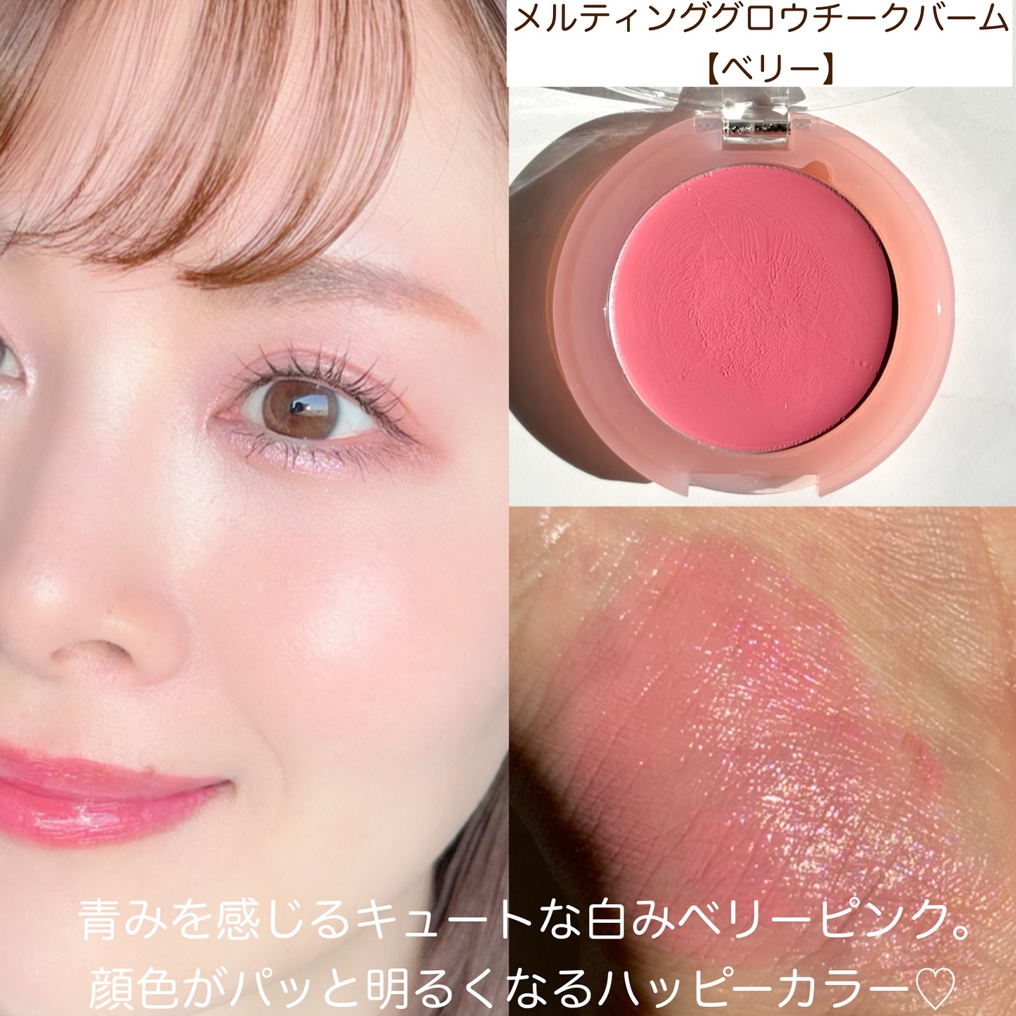 左側のラメが最高。煌めきが太陽に照らされた海の水面みたい✨ 2色だから時短メイクにもなるし、 締め色がないから簡単に抜け感のある優しげアイに♡ この色、本当に好き😍 光が当たる場所によって オーロラのように輝くシャイニーピンク。 可愛くないわけがない😩💕 頬に赤みが出やすいタイプの私ですが、 これを塗るとその赤みがいい感じに調和されて 透明感がぐんとあがったように見える✨ 自然にツヤ玉もできるから多幸感アップ♡ アイシャドウとチークを合わせて使うのが好き🫶 どちらともラメ感が最高に可愛いから 実物見に行ってほしいくらいおすすめです❤️🔥