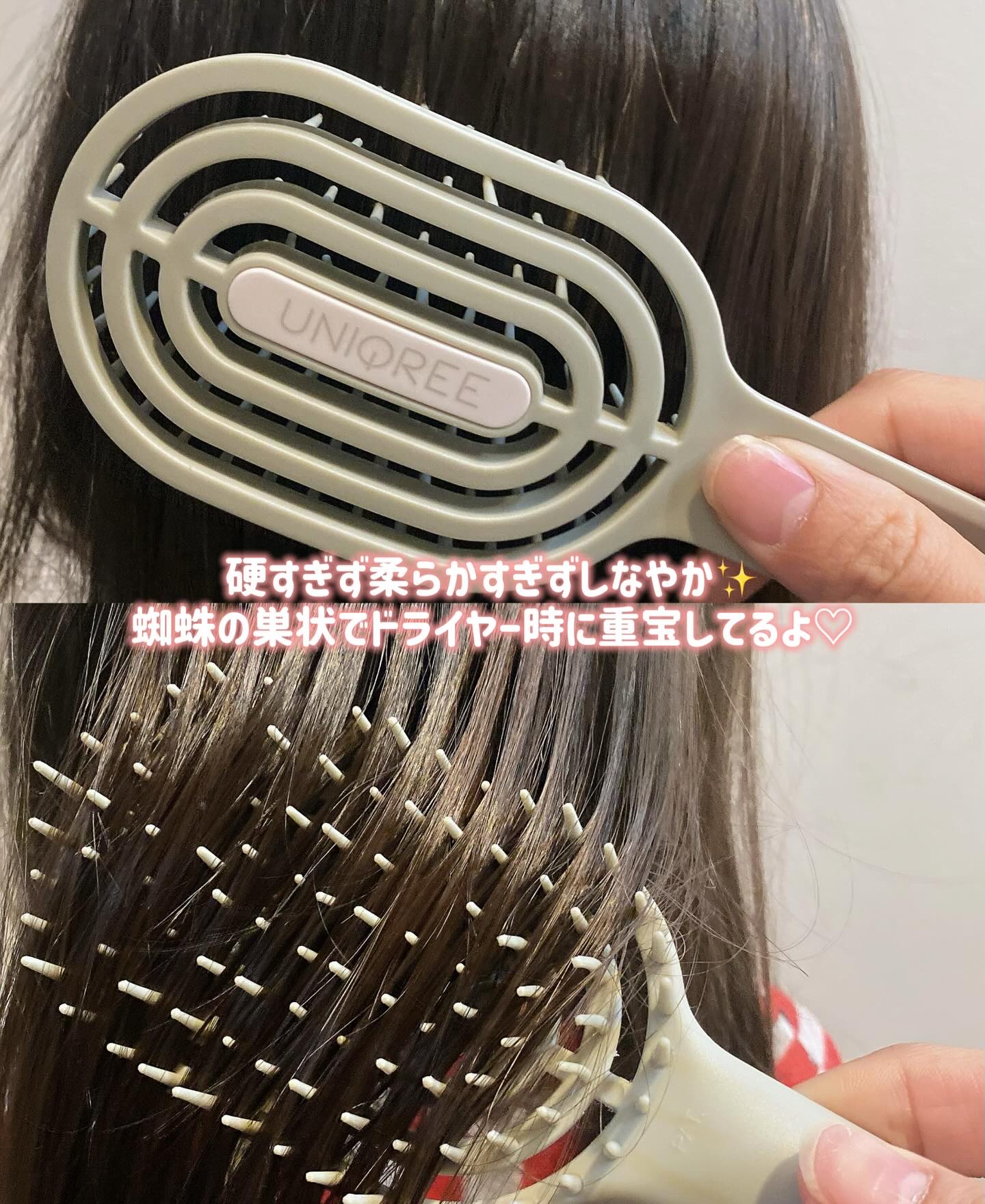 - #バズリブラシのいいとこどり #立つヘアブラシ #まるっと洗えるヘアブラシ ✨コレ1本でヘアケア悩みを解消✨ ①ブラッシング&スタイリング ②ドライ&ブロー ③スカルプケア ④トリートメントコーム 💡おすすめPoint💡 1)特徴的なピン ⇒長さの異なる3本のピンが短い毛~長い毛までしっかりキャッチ ⇒タテ・ヨコ・ナナメ満遍なくとかせて、簡単にやさしくサラサラに ⇒しなやかなピンで、濡髪も細い毛も負担が少なくダメージ減 ⇒円錐形のピンで、トリートメントがピンに付着しづらく、髪に馴染む 2)ブラシ構造 ⇒クモの巣みたいな通気性の良い構造で、速乾だから熱ダメージ減 ⇒水はけも良いので、お風呂でも使いやすい ⇒頭の丸みにあわせてカーブ状だから、頭皮にフィットして気持ちいい ⇒やわらか素材なので、スカルプケアも頭皮にぴったり 3)軽量+コンパクト ⇒「立つヘアブラシ」ケースを付ければ、自立するから、すき間収納OK! ⇒軽量&コンパクトでケース付き、旅行も携帯もラクラク 4)まるっと洗えて清潔 ⇒スタイリング剤・汗でベタベタ髪も大丈夫! ⇒海やプールでも使っても洗える
