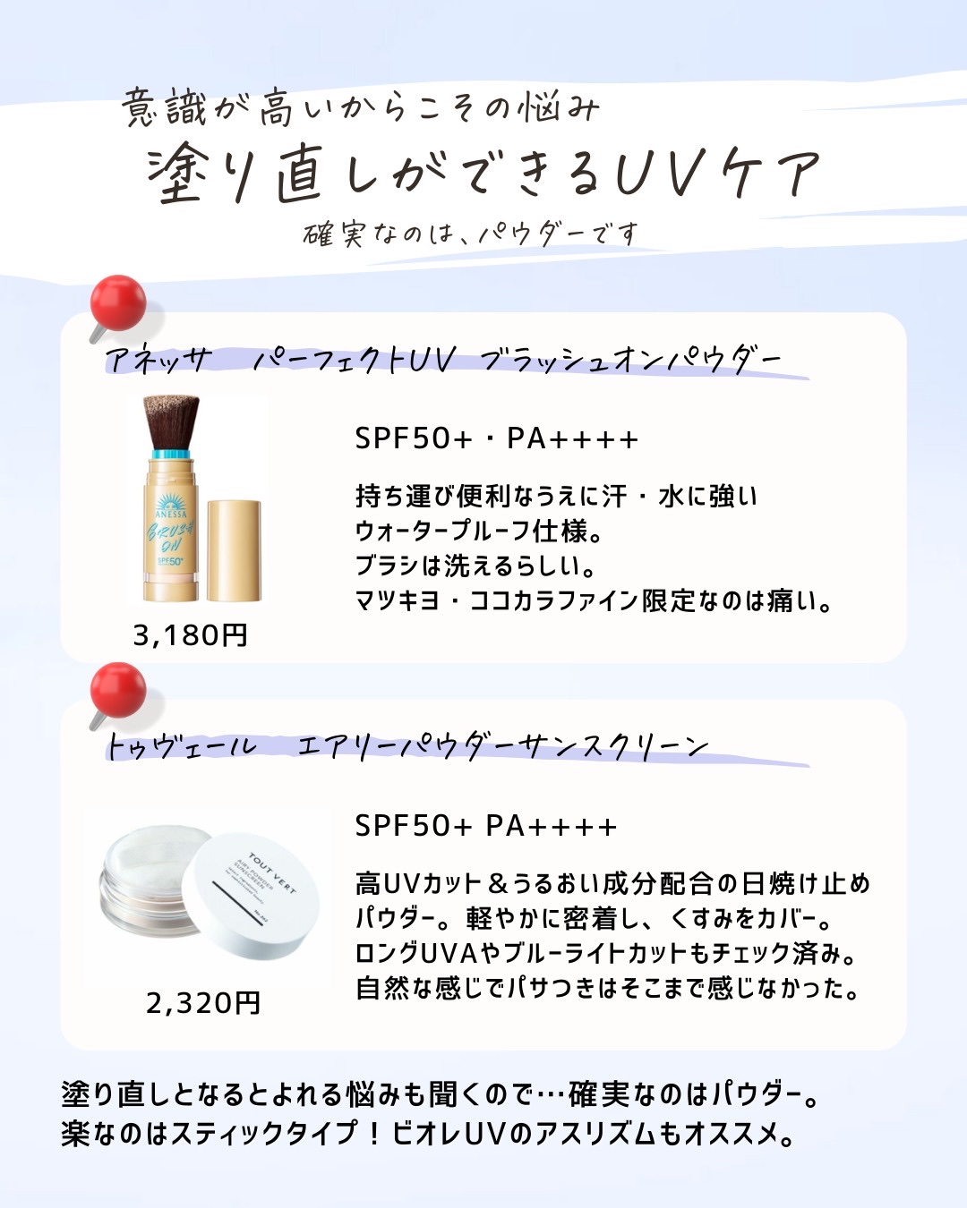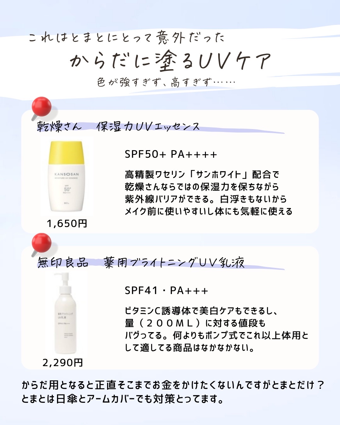 特定の有効成分を試してみたい。美容成分を試したい。そんな時は代用してもいいけど、それって似てるのかな?って思うときが正直ある。 同じ成分があっても実は濃度が違ったり、処方技術が違ったり。技術が違うと使用感も剤型も変わることがあることは知ったうえで使うといいかも。 せっかくプチプラ化粧品を買うならそれはそれで楽しんでほしいから是非念頭にいれてほしいな!!