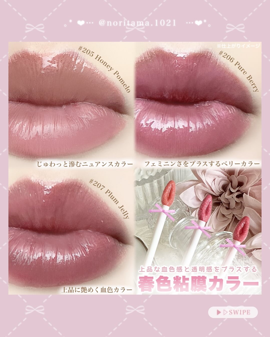 新感覚✨6色のカラーが30%、70%の2パターン展開で濃度が選べる😳 プランパー効果があるから、ボリューム感がでて縦じわの目立たない理想的なうるうるリップに… 発色はもちろん、グロス特有のベタつきがなくぷるんと仕上げてくれて乾燥しない使い心地のよさもお気に入り🥹💓
