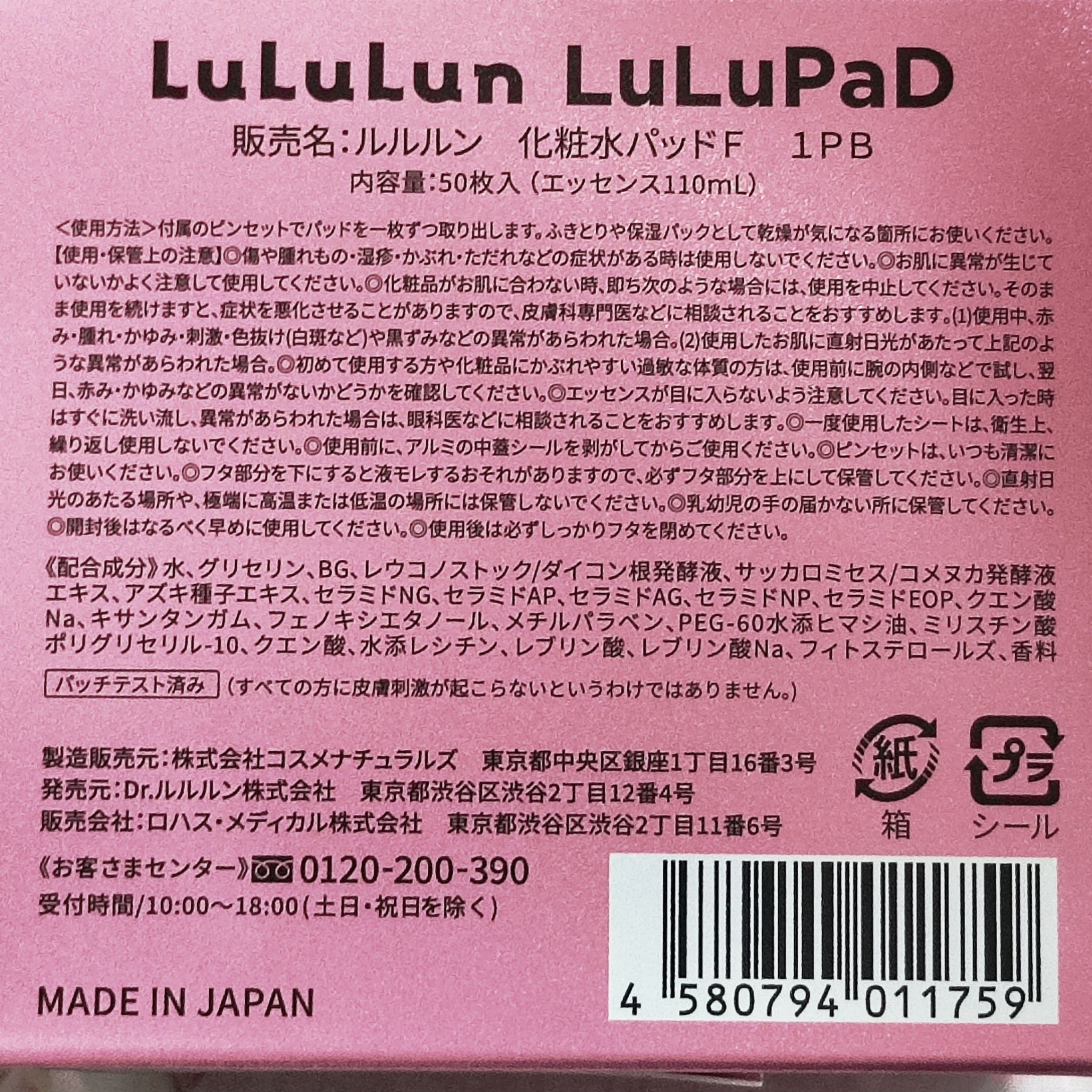 - <ルルルン トナーパッド うるおいON> 水、BG、グリセリン、キサンタンガム、フェノキシエタノール、メチルパラベン、香料、セラミドNG、水添レシチン、クエン酸、セラミドNP、PEG-60水添ヒマシ油、セラミドAP、セラミドEOP、ミリスチン酸ポリグリセリル-10、フィトステロールズ、クエン酸Na、レブリン酸、レブリン酸Na、セラミドAG、サッカロミセス/コメヌカ発酵液エキス、アズキ種子エキス、レウコノストック/ダイコン根発酵液