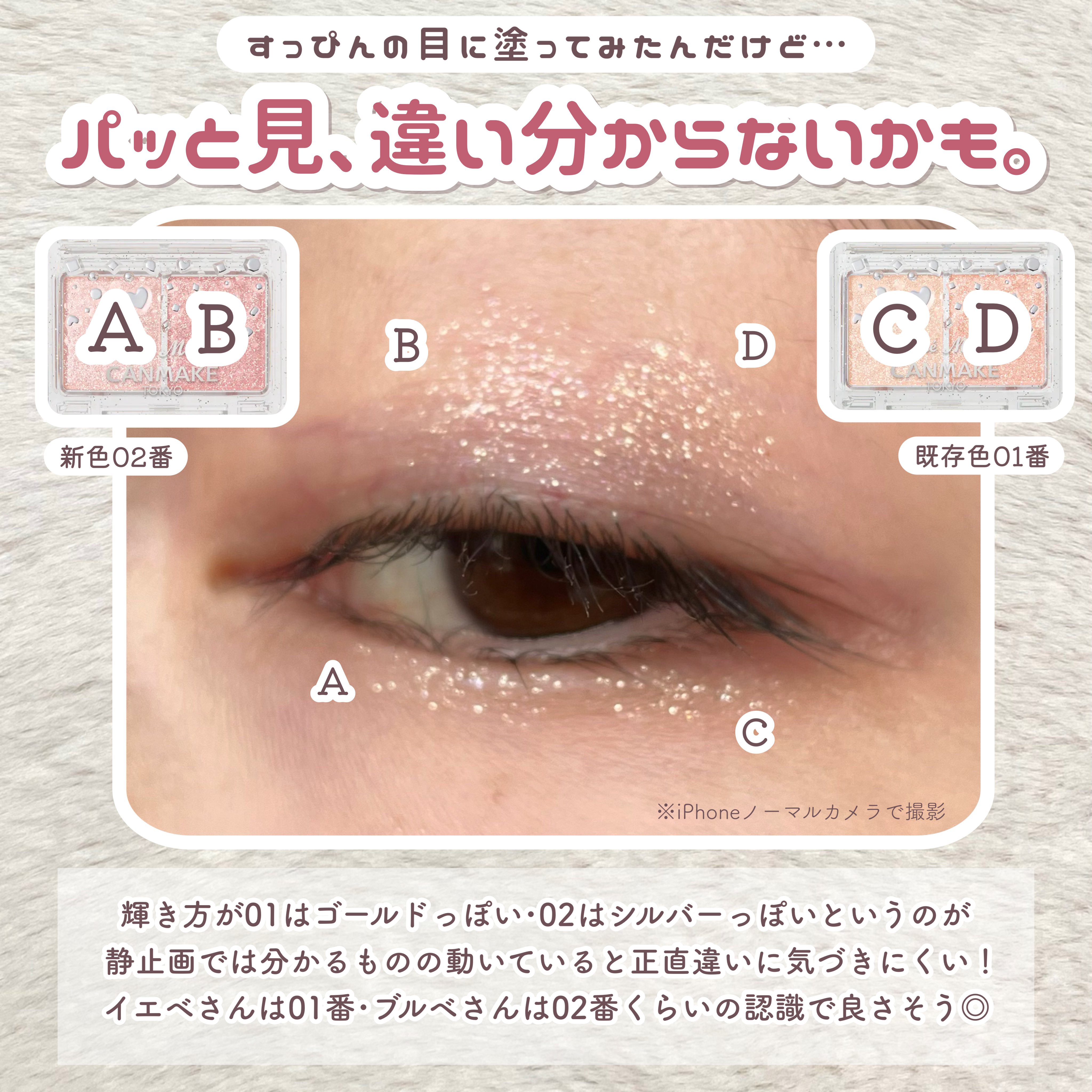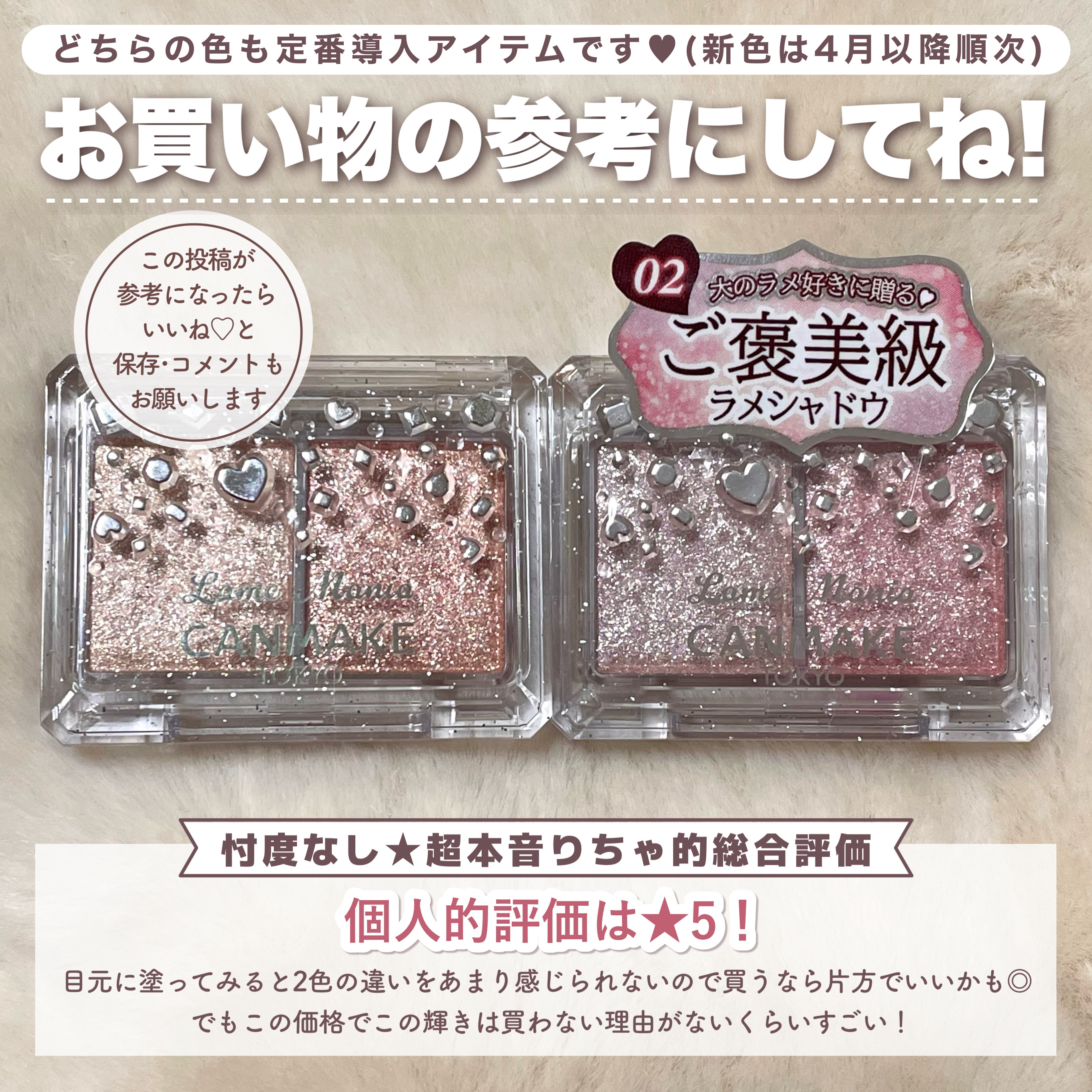 - ※03は2025年11月下旬よりロフト・プラザで先行発売。2026年3月下旬発売予定で2026年4月以降定番導入予定となります。 自分の気持ちを上げる♪ キャンメイク史上最もキラキラ!?ご褒美級ラメシャドウ✨ 高輝度、高密着! ラメ好きさんには是非使ってほしい✨ まるで発光しているかのように輝く大粒ラメアイシャドウです。 他のアイシャドウの上から重ねても濁らない 透明度の高いラメで、美しい輝きが楽しめます。 まるでラメの膜が張るようにぴたっと密着! ラメ飛びしにくく、キレイな仕上がりが長時間続きます。 【同系色の2色入り】 左:カラーレスメイクや、淡いアイシャドウに合わせやすいラメ 右:ほんのりベースカラーが発色する、華やかなカラーラメ