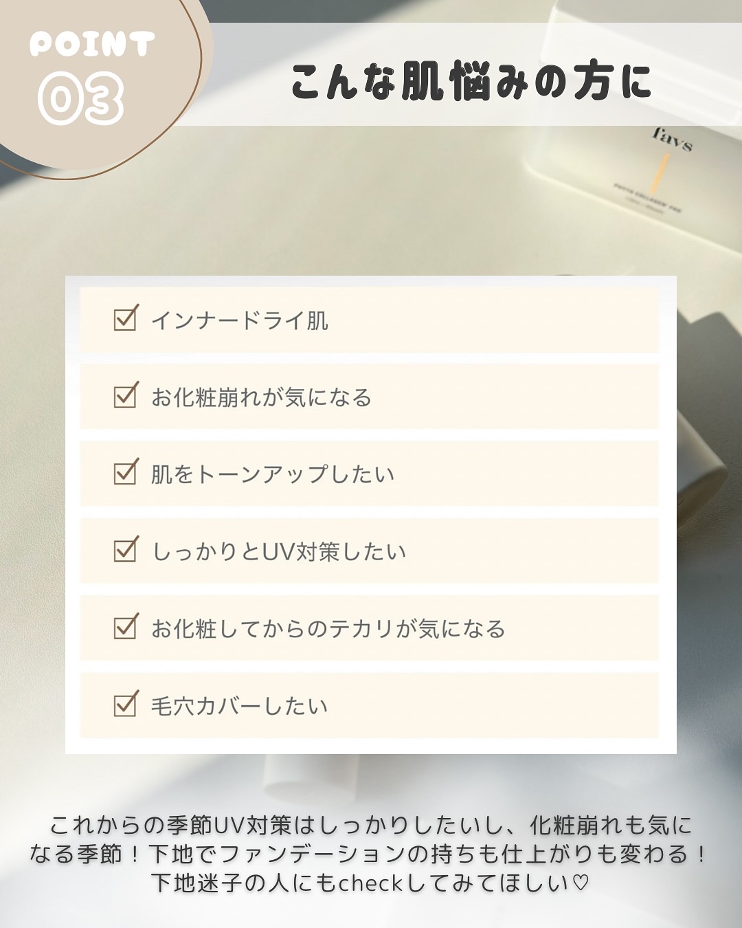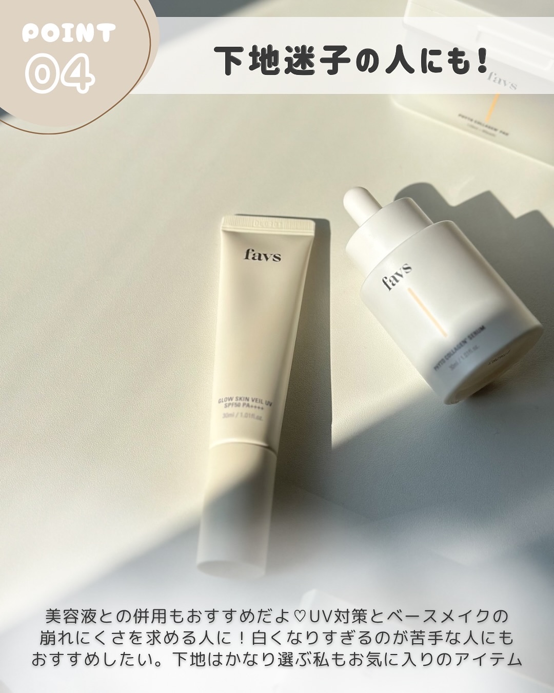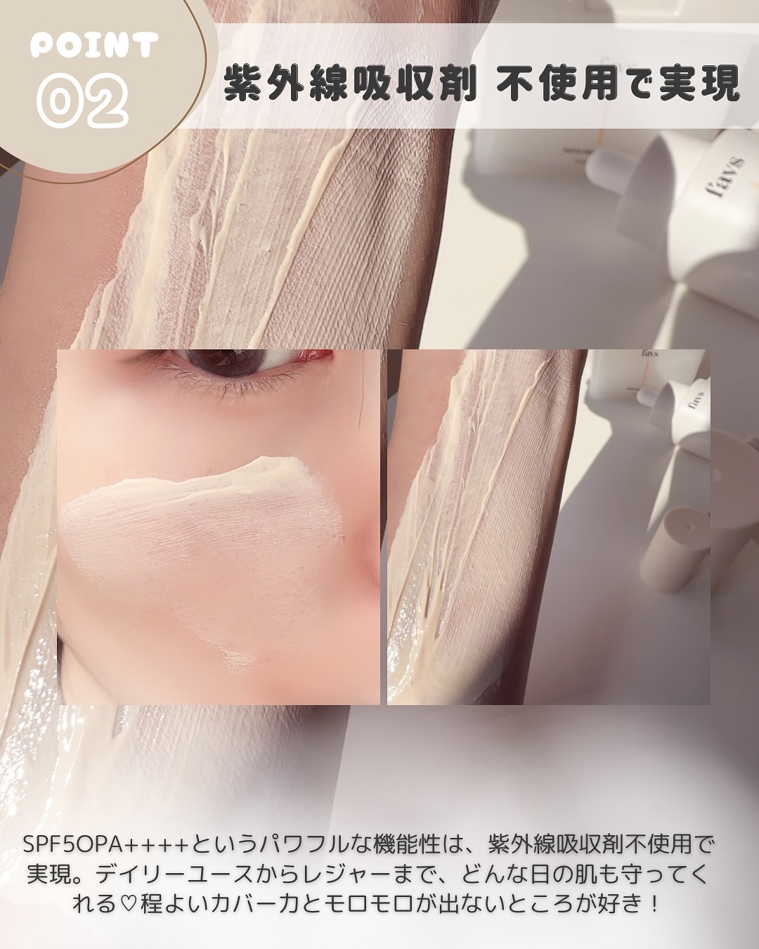 - POINT01:GLOW──たっぷりの水分で、透き通るようなツヤを。 心地よいみずみずしさと透明感*¹を追求し、ウォータリーベースにこだわりました。ヘルシーなツヤを肌から引き出しながら、アロエベラやヤマイモのエキスからなるスムースモイストコンプレックス*²が、日中の肌をさわやかに保湿します。インナードライ肌の対策にもおすすめです。 *¹うるおいによって肌に明るい印象をもたらすこと *²アロエベラ葉エキス、マコンブエキス、ヤマノイモ根エキス、ウルムスダビディアナ根エキス、スミレ花エキス(すべて整肌成分) POINT02:SKIN VEIL──肌の引き締めやテカリの悩みにアプローチし、ベースメイクを格上げ。 ファンデーションの仕上がりを左右するのは、肌の「なめらかさ」と「さらさら状態」がキープできるかどうか。肌の引き締めが気になる肌をケアするスムースモイストコンプレックス*¹と、皮脂吸着パウダー*²のシナジーで、下地効果で肌表面をカバーすることにより毛穴や凹凸の気にならない、するするとなめらかな肌状態を作ります。ファンデーションが薄膜できれいに乗り、その美しさが持続する肌へと整えます。 *¹アロエベラ葉エキス、マコンブエキス、ヤマノイモ根エキス、ウルムスダビディアナ根エキス、スミレ花エキス(すべて整肌成分) *²メタクリル酸メチルクロスポリマー(整肌成分) POINT03:UV──紫外線吸収剤不使用なのに、透明感*¹のある軽やかな仕上がり。 海でのレジャーも思い切り楽しめるよう、紫外線吸収剤不使用にこだわりました。2種のミネラルパウダー*²を絶妙な割合で配合し、白浮きやきしみを感じさせないスキンケアのような使用感と、SPF50 PA++++の実現を両立。強烈な日差しの日も、肌をしっかりとガードします。 *¹メーキャップ効果による *²酸化亜鉛、酸化チタン(すべて整肌成分)
