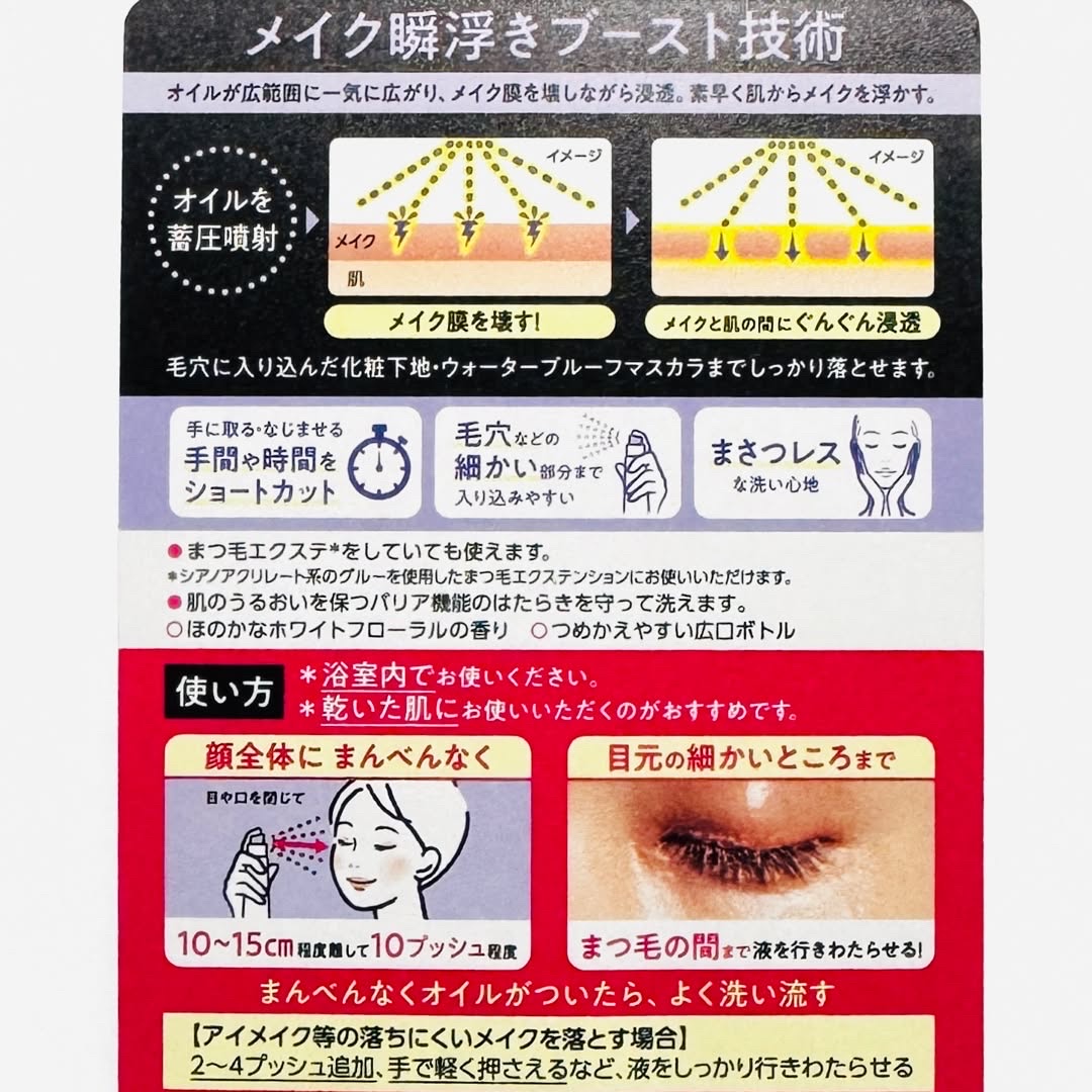 - つけるだけメイク瞬浮き、くるくるなじませずに落ちる! ウォータープルーフマスカラ・毛穴のメイクまでしっかりオフするのに、肌つっぱりにくい。 【カサつきがちなデリケート肌にも使える】 ・肌になじませるときの摩擦を最小限*1に抑えた設計 ・肌の潤いを保つバリア機能を守って洗えます。 【ストレス低減設計】 ・なじませる手間なしで時短になる ・まさつレスな洗い心地 ・つめかえやすい広口ボトル ●まつ毛エクステをしていても使えます。*2 ●ほのかなホワイトフローラルの香り *1ビオレメイク落としシリーズ内比較 *2シアノアクリレート系のグルーを使用したまつ毛エクステンションにお使いいただけます。